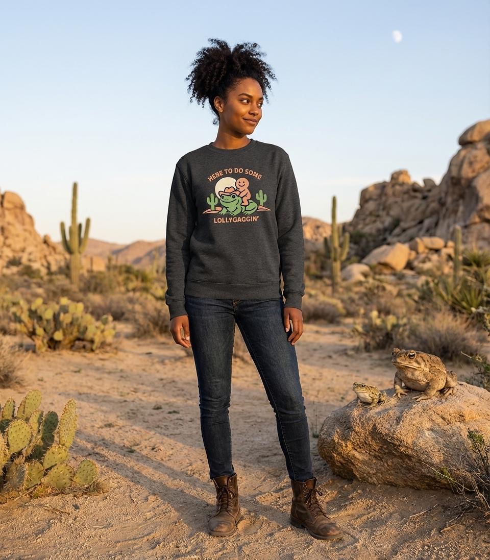 This design features a cheerful frog wearing a cowboy hat, carrying a smiling gingerbread-like character on its back. Set against a desert backdrop with cacti and a warm sun, it encapsulates a whimsical and laid-back scene, inviting smiles and relaxation.