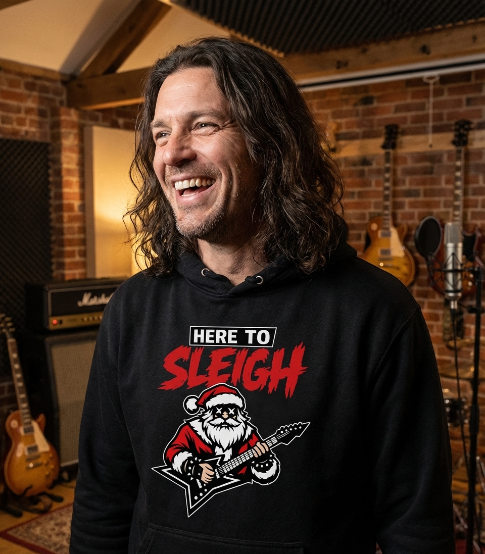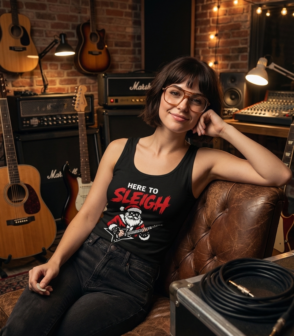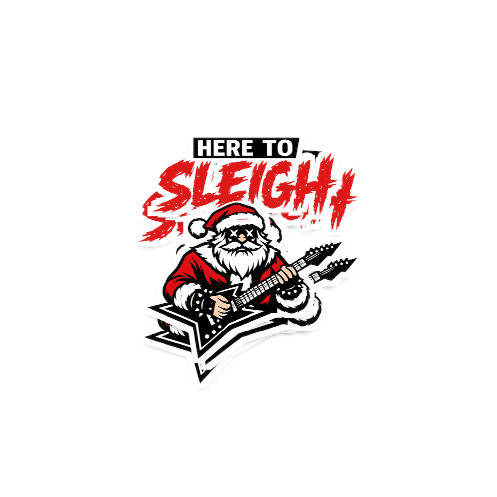 "Here To Sleigh" is a pun on "Here To Slay," which means to perform exceptionally well or to dominate. In this context, it combines Santa's traditional sleigh rides with the energetic performance of a rock star. It embodies a fun, rebellious, and confident spirit for the holiday season.