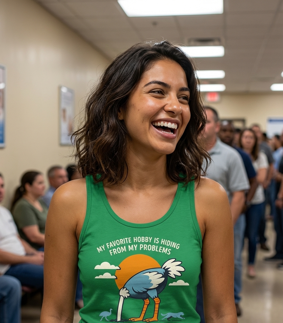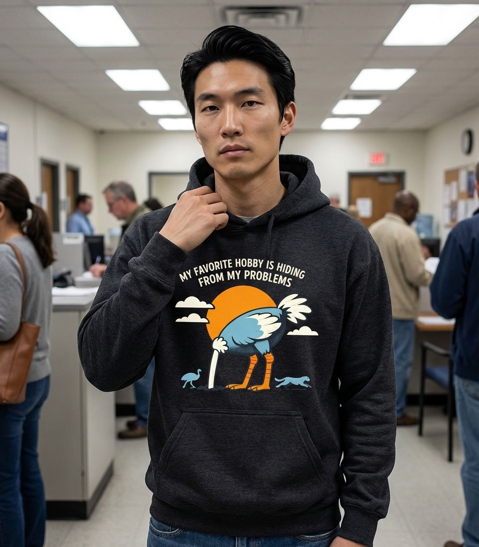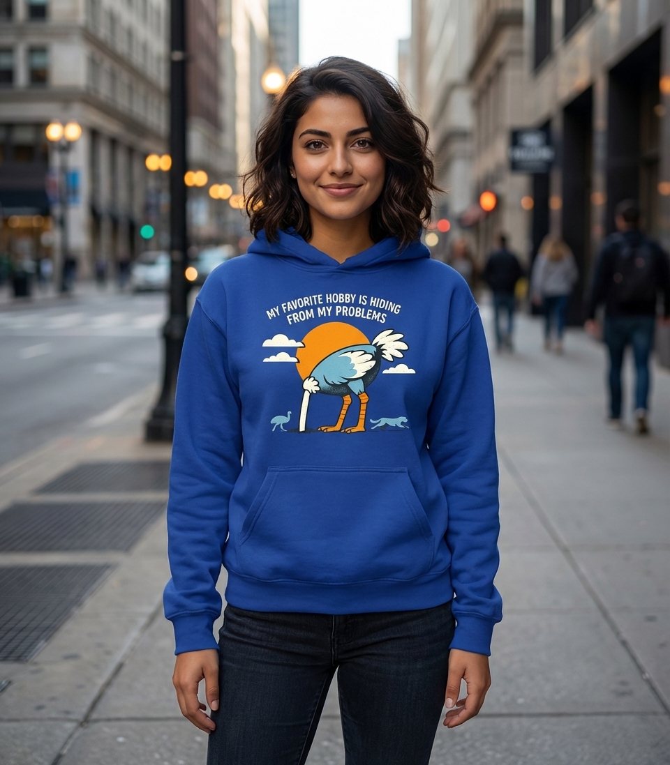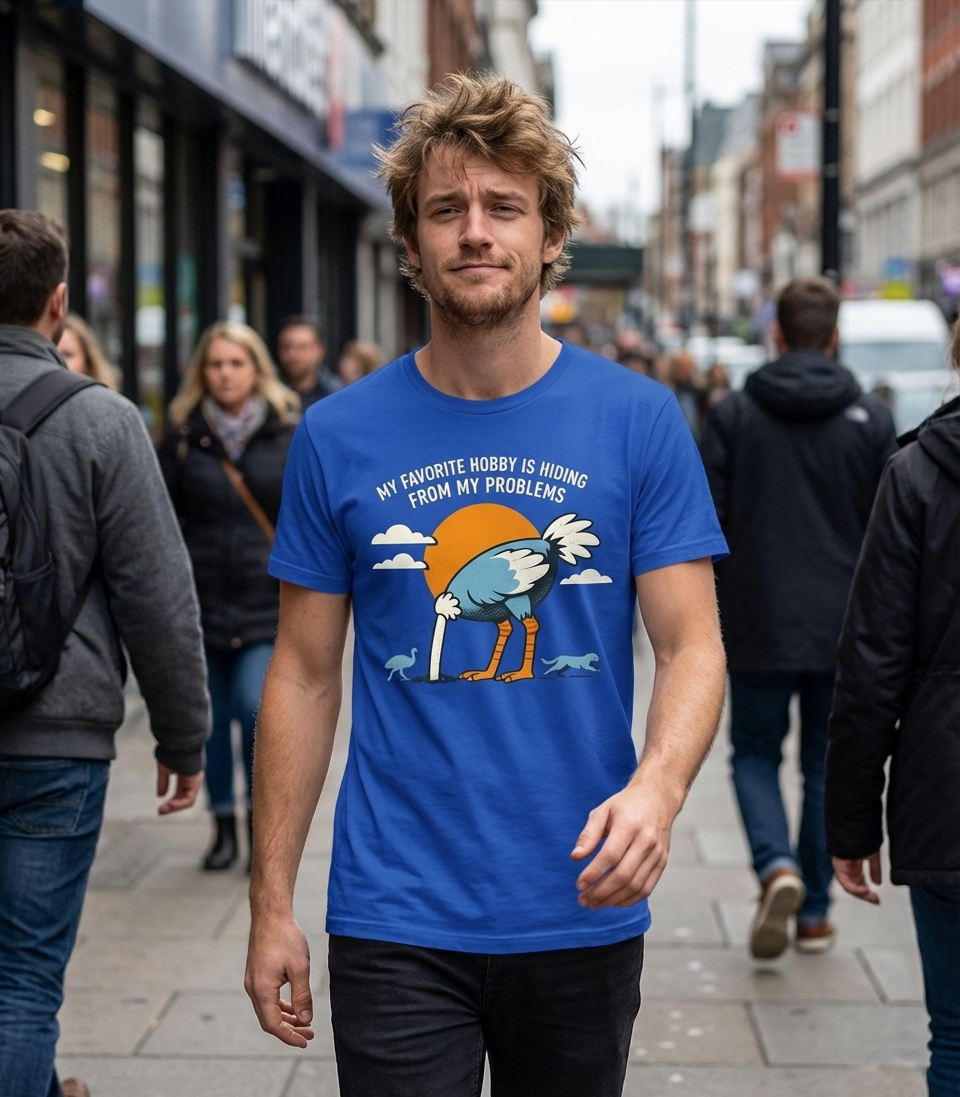The phrase "My Favorite Hobby Is Hiding From My Problems" is a sarcastic and relatable commentary on modern life. It expresses a common human tendency to procrastinate or avoid confronting issues directly, often with a lighthearted, self-aware attitude. This design transforms a well-known idiom into a witty personal statement.