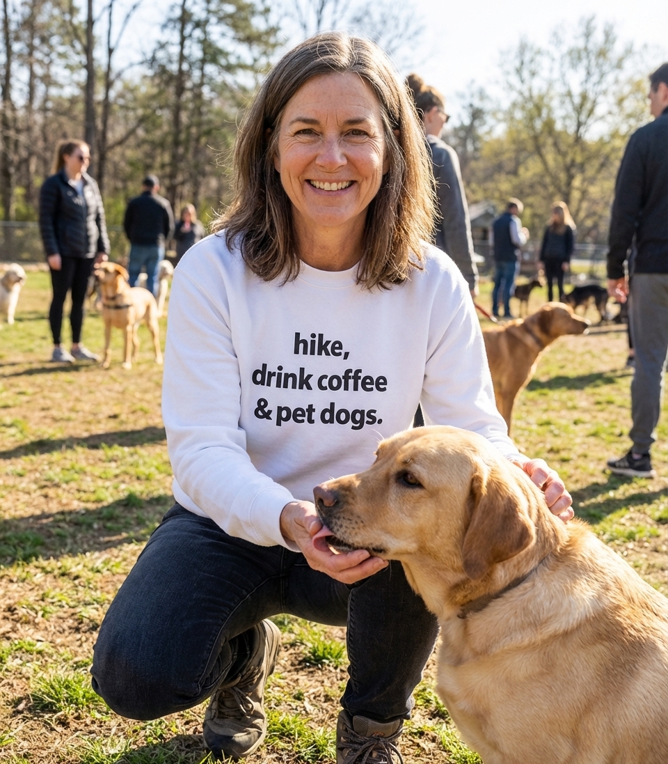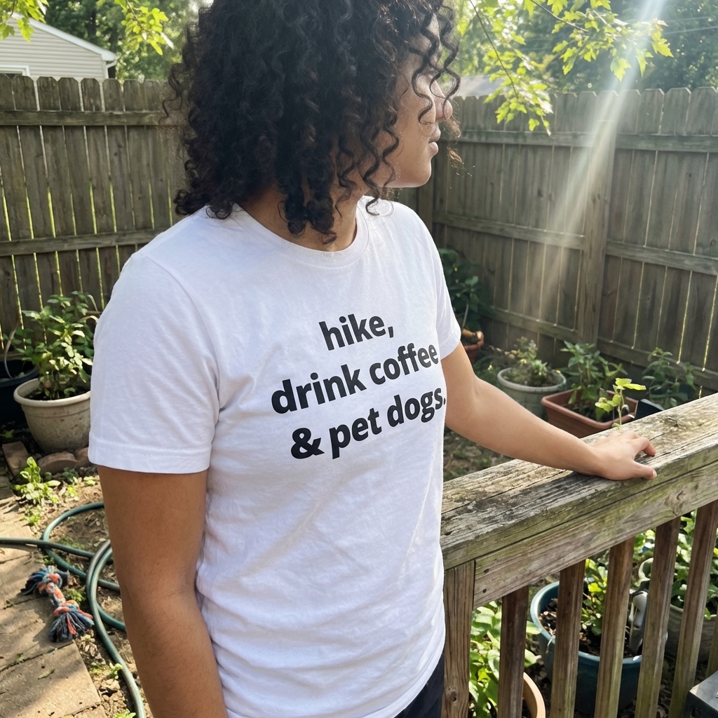 Obsessed with this shirt! The "hike coffee dogs" design is such a cool, subtle nod to my favorite things, and it looks even better in person. Plus, it's super soft, definitely gonna be a new go-to.