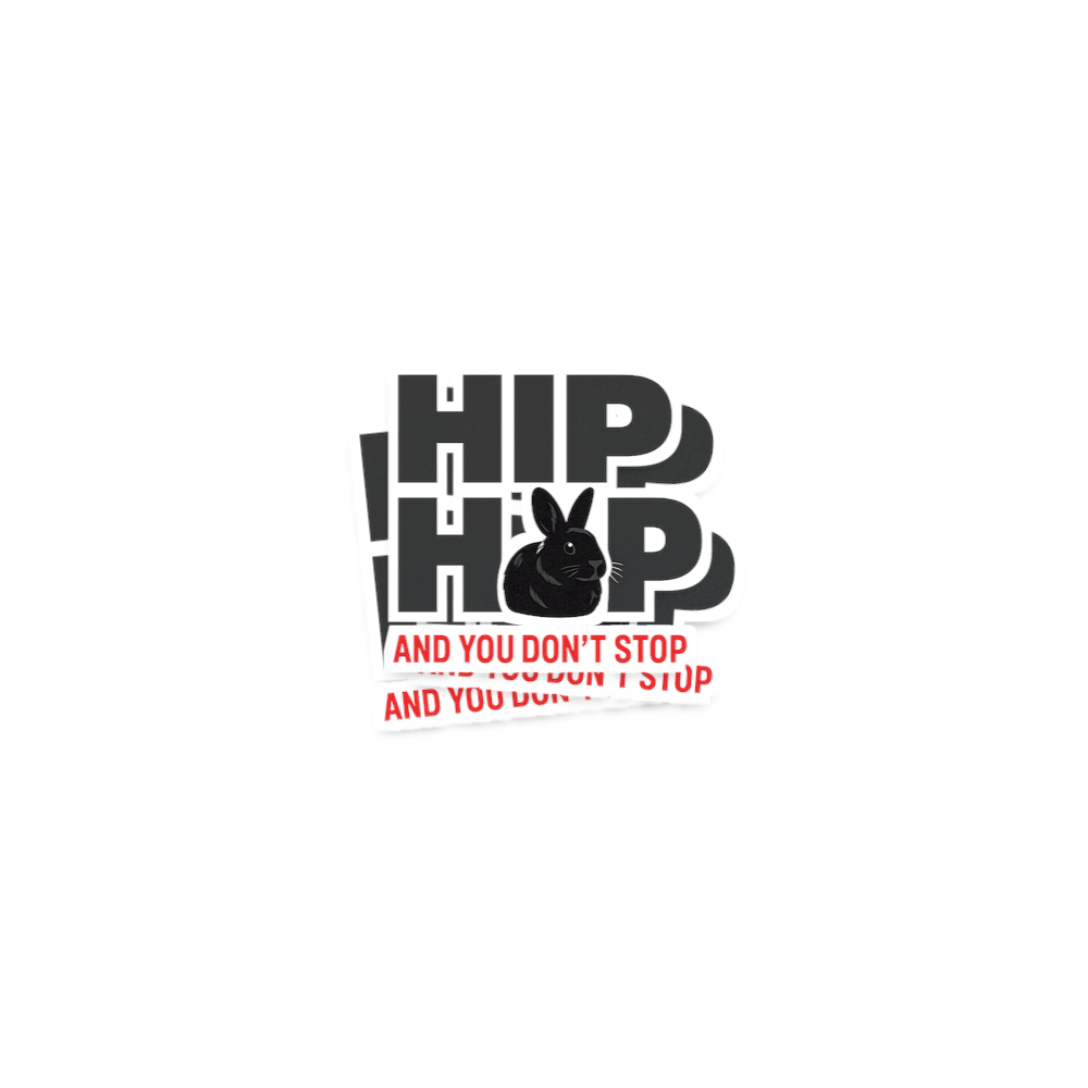 This playful design cleverly integrates a black rabbit into the iconic "HIP HOP AND YOU DON'T STOP" lyric. The rabbit visually represents the "hop" in hip hop, creating a fun and unexpected twist.