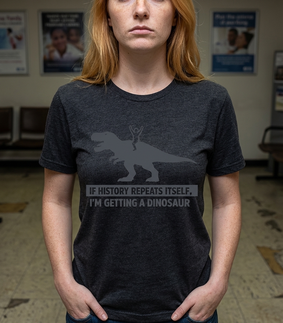 The saying "If history repeats itself" is a common idiom suggesting that past events often recur. This design cleverly twists that phrase, adding a humorous and absurd desire for a dinosaur as a personal ride, poking fun at the idea of historical cycles and unexpected outcomes.