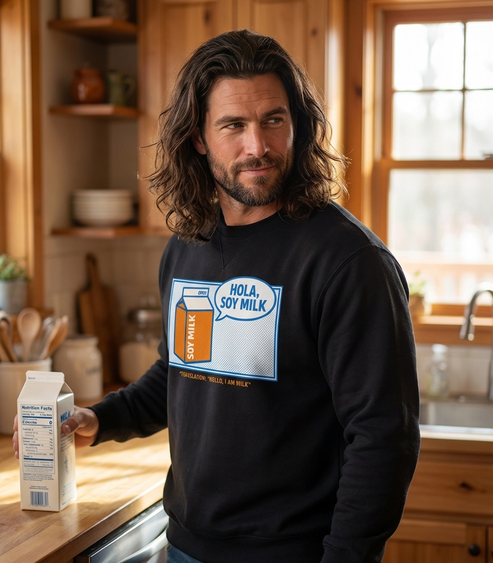 The phrase "Hola, Soy Milk" plays on the Spanish "Soy" (meaning "I am") and the English product "Soy Milk." When translated, it becomes "Hello, I am milk," a witty introduction from the plant-based beverage itself. It's a classic example of a "dad joke" or lighthearted linguistic humor.