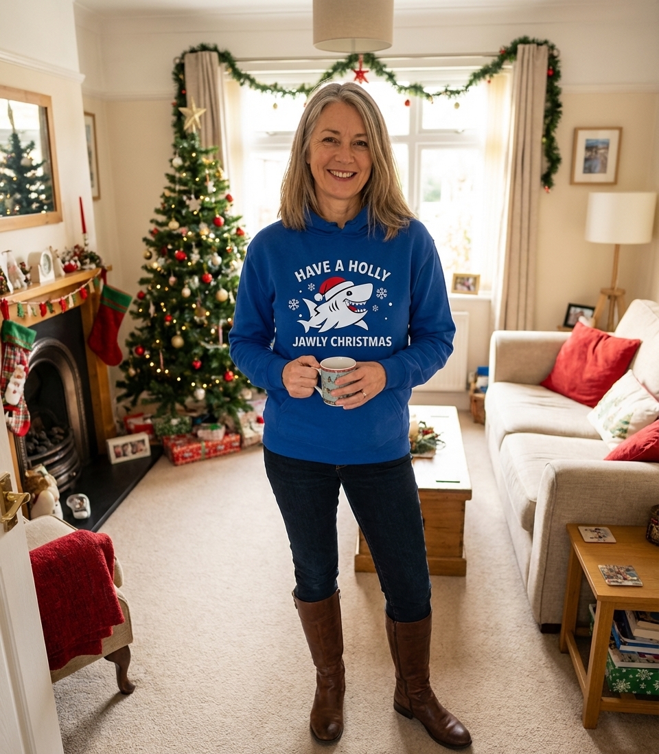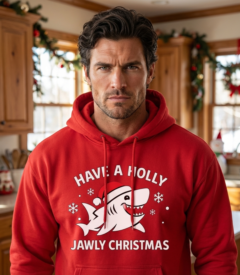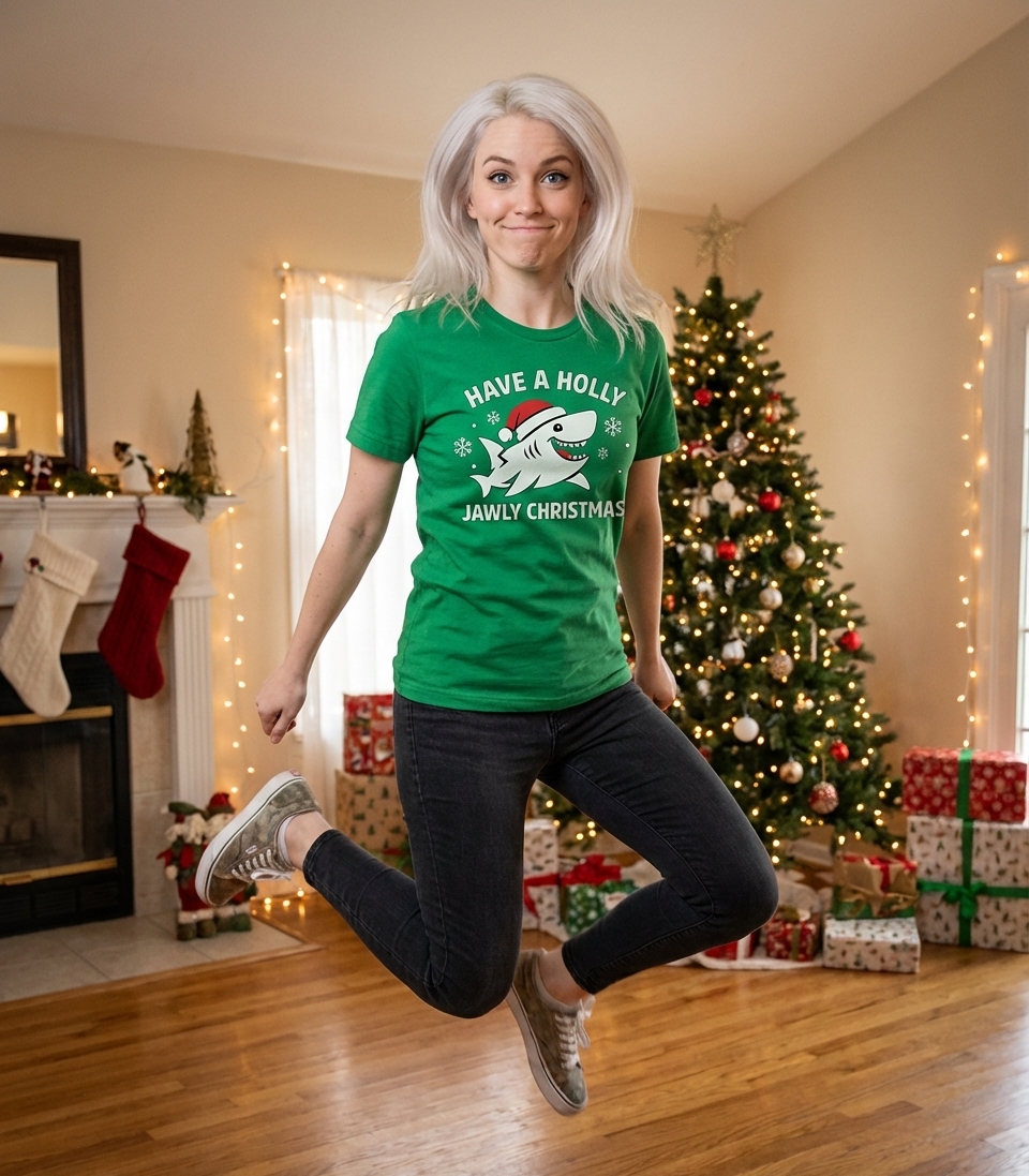 The phrase "Have a Holly Jawly Christmas" is a humorous pun on the traditional holiday greeting "Have a Holly Jolly Christmas." It cleverly incorporates "jawly," referencing the shark's prominent feature, to create a witty and memorable festive message.