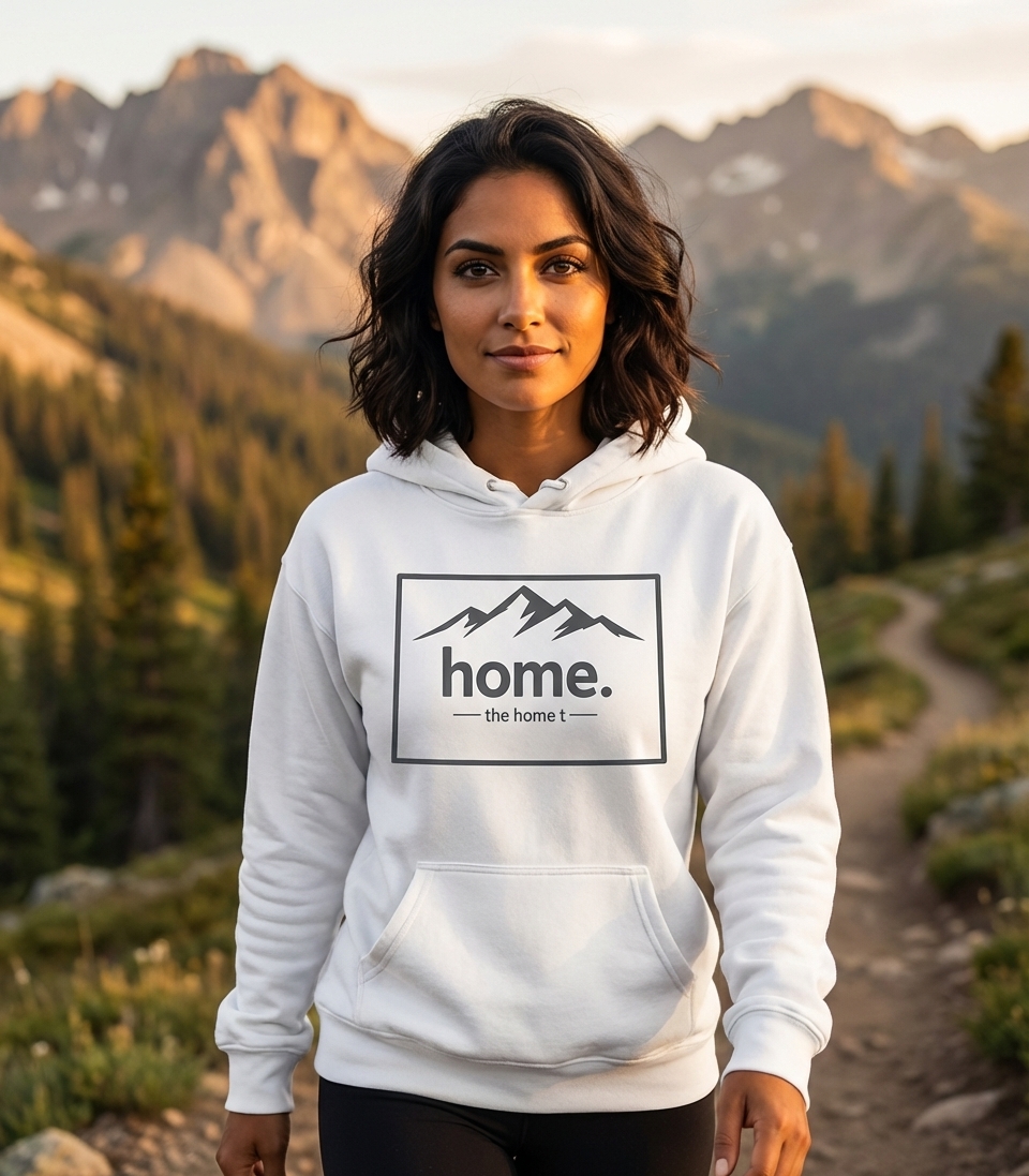 The 'Home' phrase with a mountain vista captures the lifestyle of passionate outdoor enthusiasts who find comfort, adventure, and belonging amidst natural landscapes.