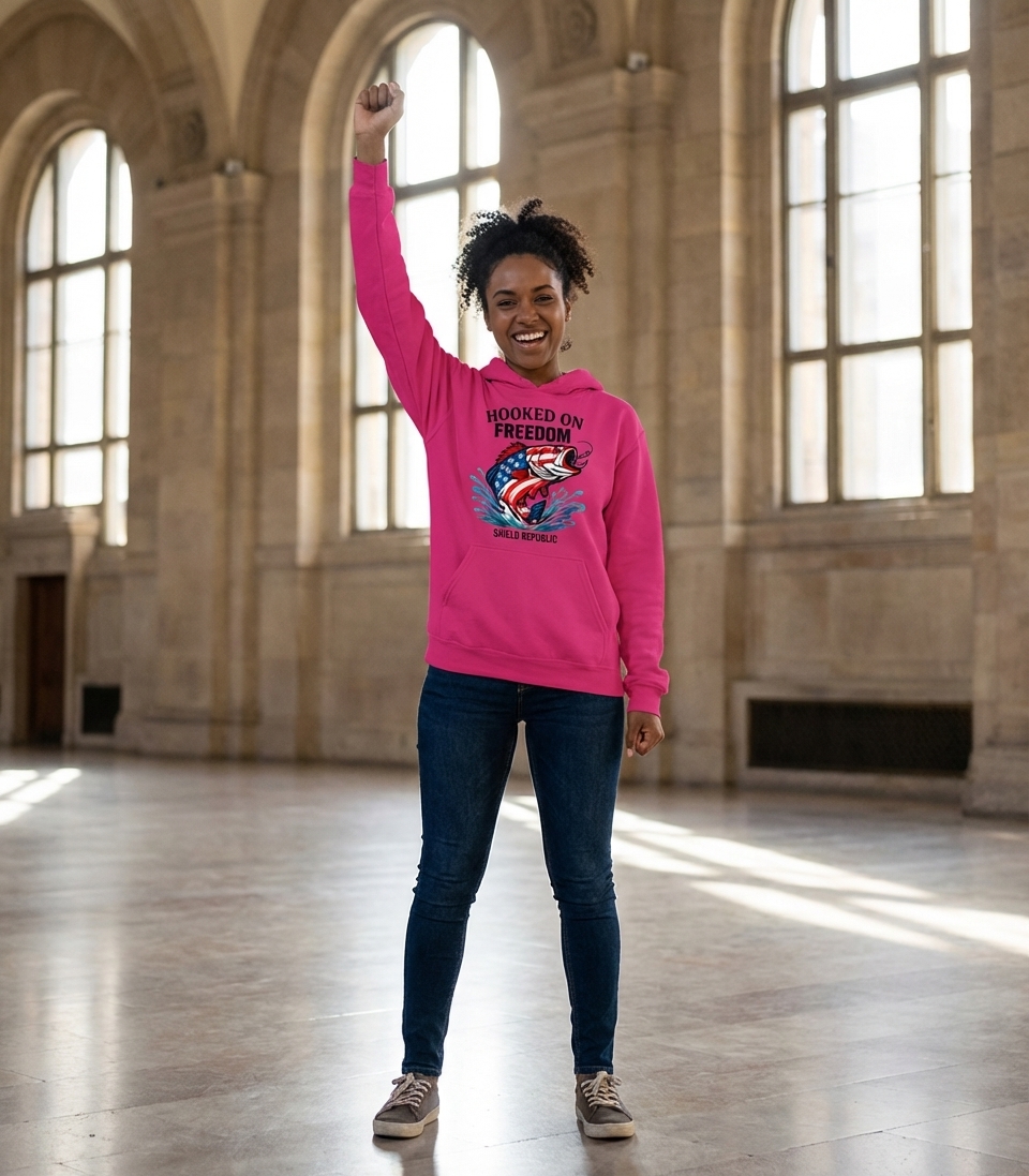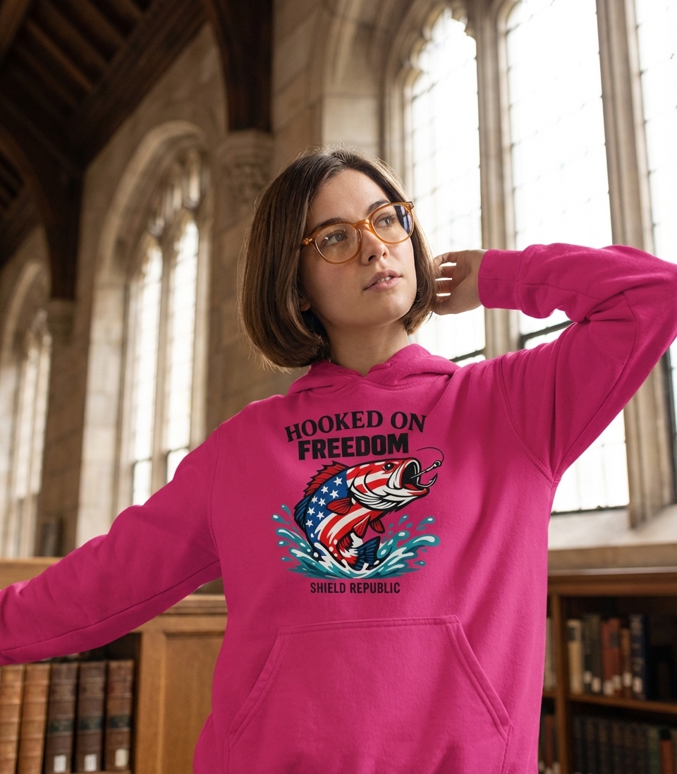 The phrase "Hooked on Freedom" is a clever play on words that merges the popular fishing term "hooked on" with the cherished American value of "freedom." It signifies a deep passion for the liberties and ideals of the United States, expressed through the lens of a fishing enthusiast's devotion to their hobby.
