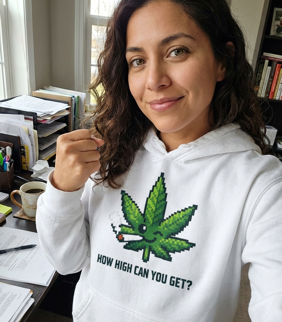 The phrase "How High Can You Get?" is a clever double entendre. It references both the recreational act of getting high from cannabis and the playful challenge of aiming for new heights or achievements. It's a humorous nod within cannabis culture.