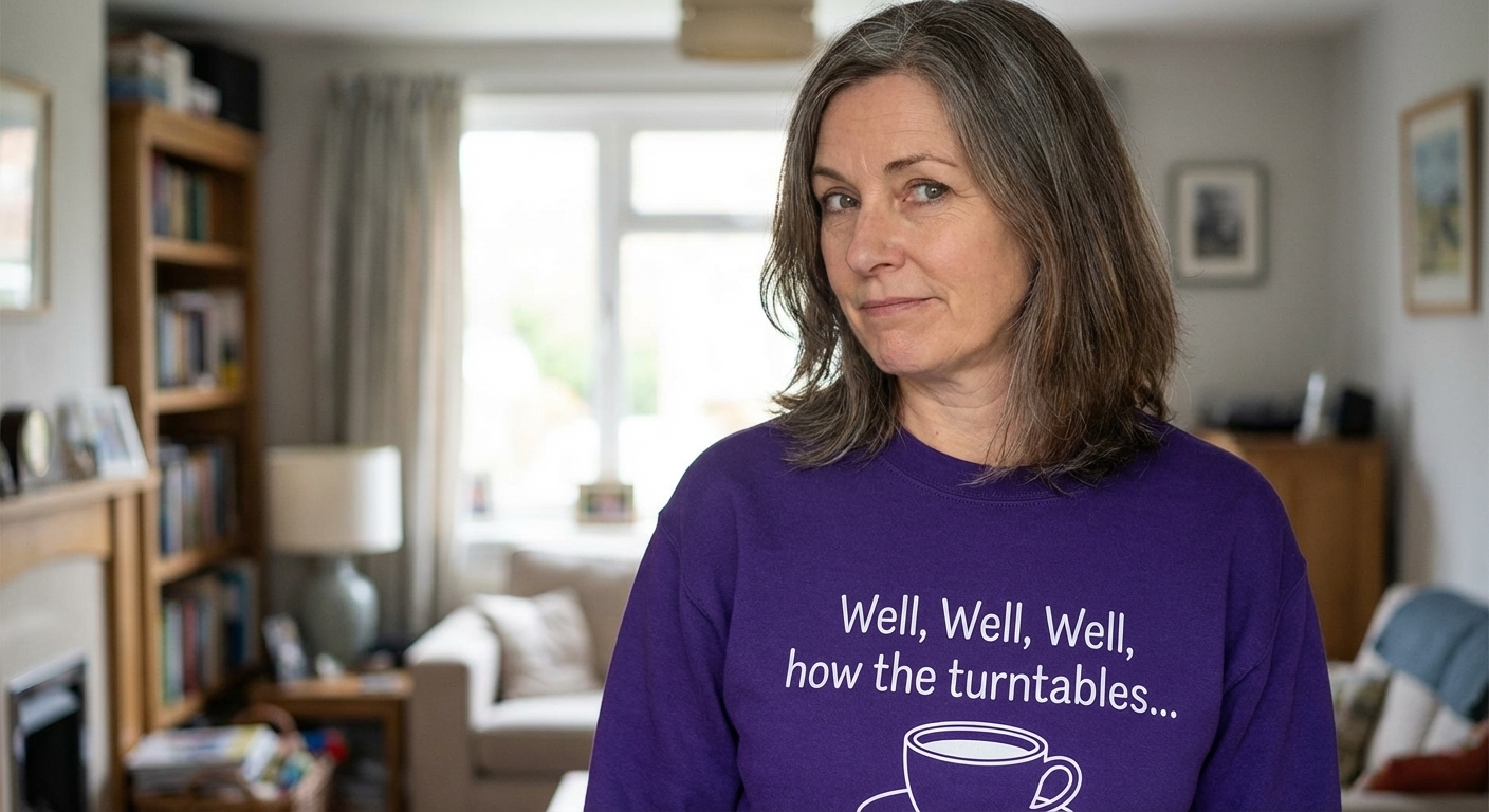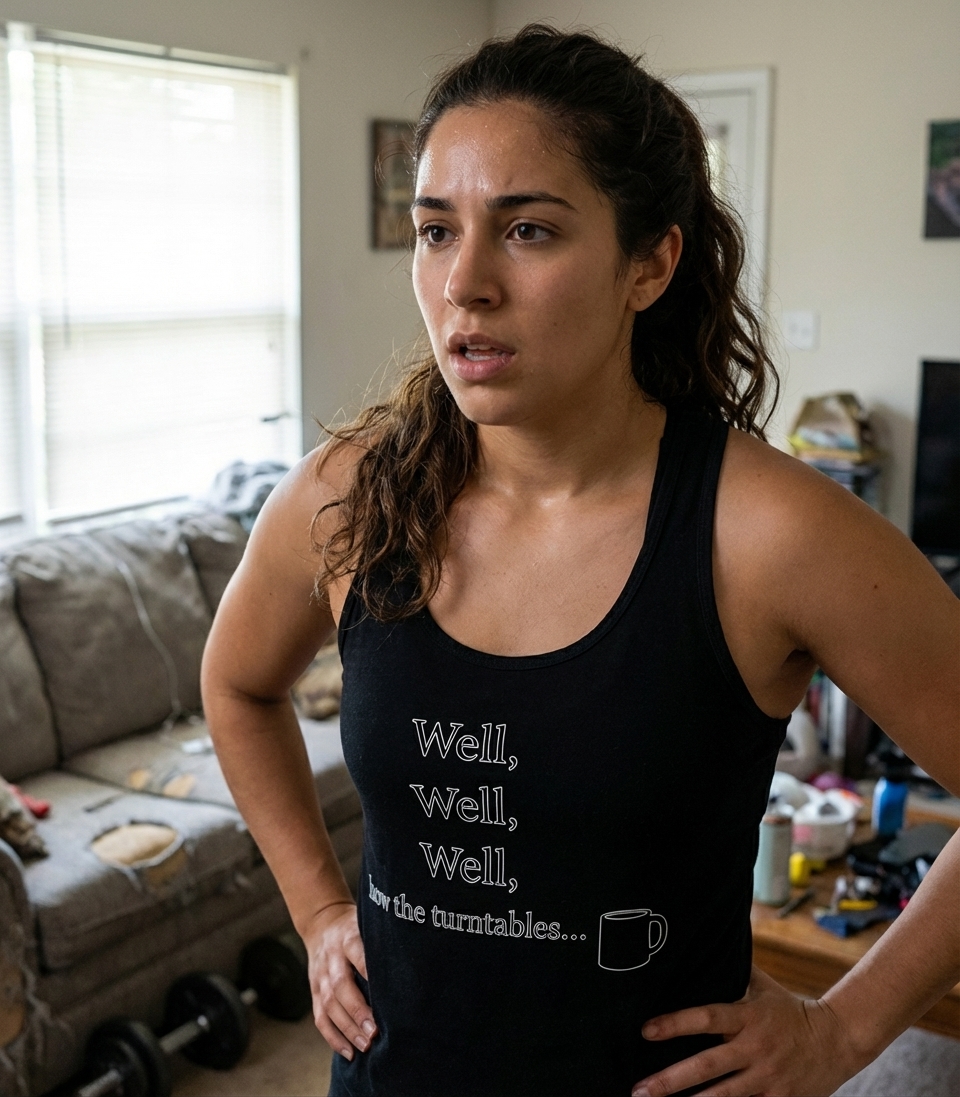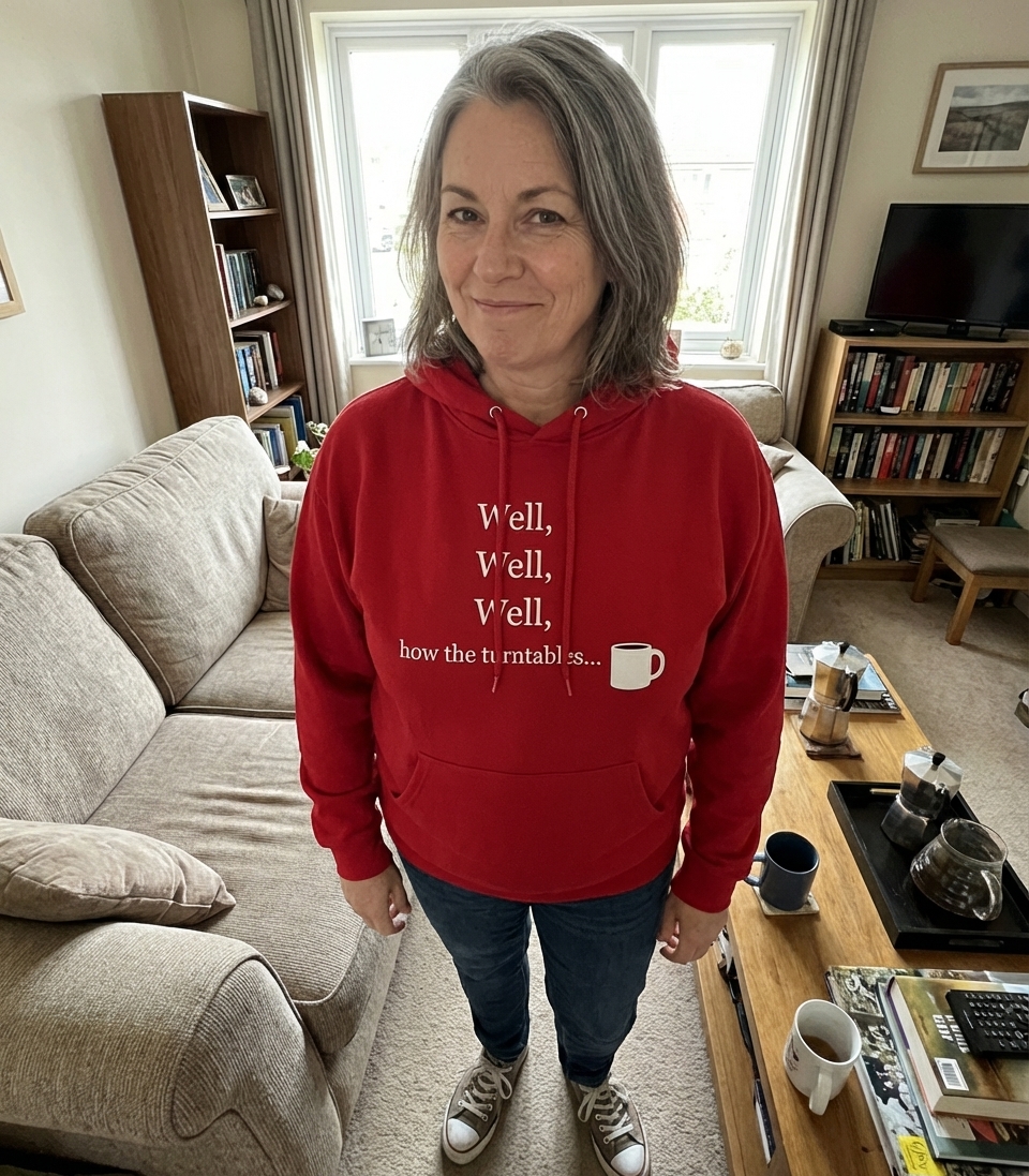 The phrase 'Well, well, well, how the turntables...' is a memorable misquote from the character Michael Scott in the popular TV show The Office. It is used to acknowledge a reversal of fortune or a change in circumstances. Here, the addition of the coffee mug cleverly transforms the ending into a visual pun, appealing to those who appreciate ironic humor and a daily dose of caffeine.