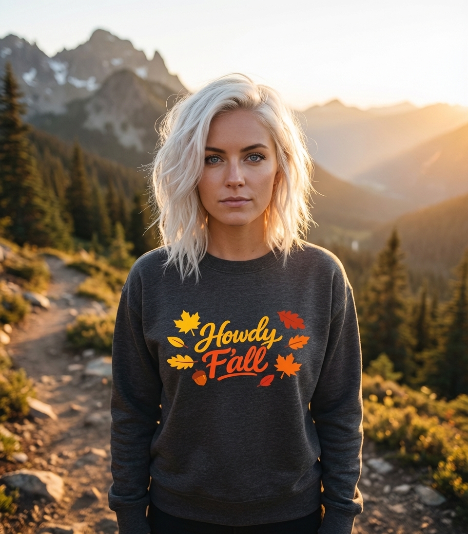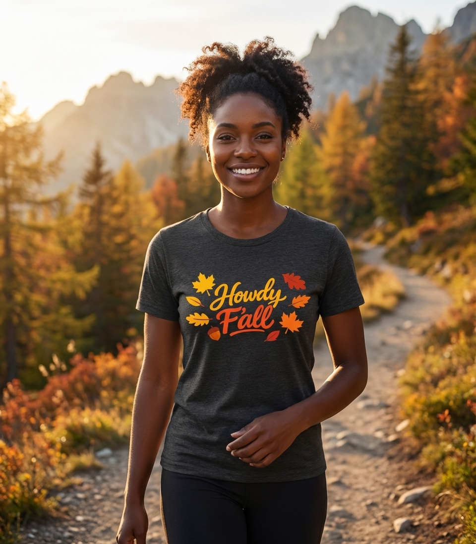 The "Howdy Fall" phrase captures the lifestyle of those who love the crisp air, vibrant colors, and cozy feeling of autumn hikes.