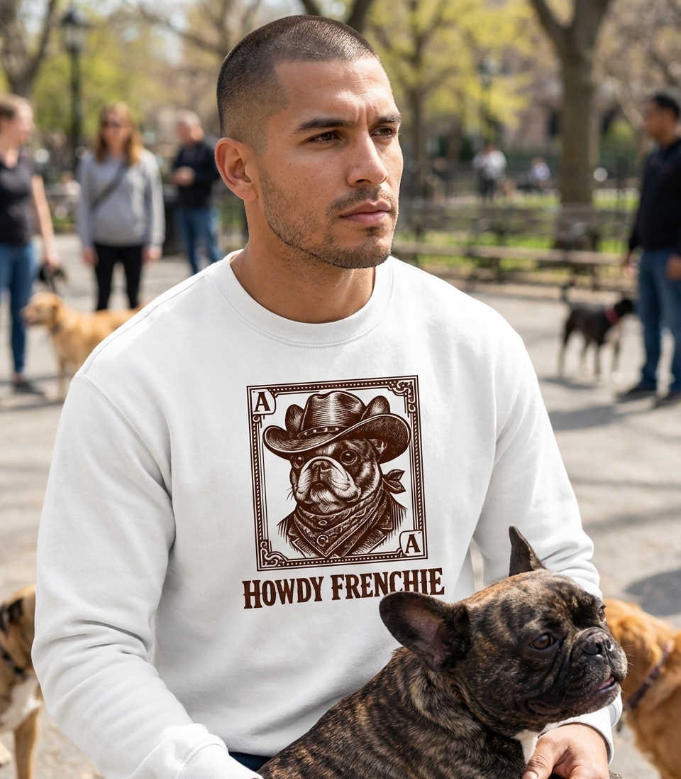 The 'Howdy Frenchie' phrase captures the lifestyle of passionate French Bulldog owners who love Western culture, unique dog art, and humorous pet designs.