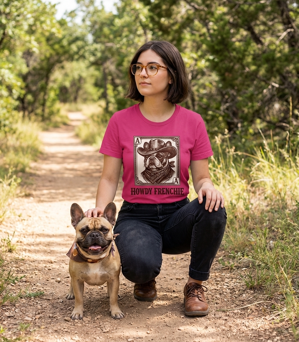 omg, this "Howdy Frenchie Cowboy Dog" tee is just the cutest thing. the design is so unique and fun, it's definitely a conversation starter. totally happy with my new shirt!