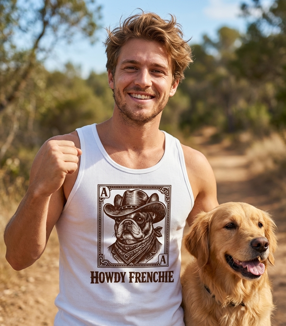 The phrase "Howdy Frenchie" is a playful greeting that combines Southern hospitality with the popular nickname for a French Bulldog. It evokes a friendly, lighthearted spirit, perfect for those who appreciate their dog's unique personality and a touch of cowboy charm.