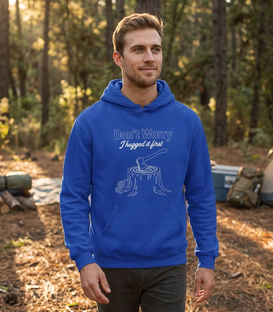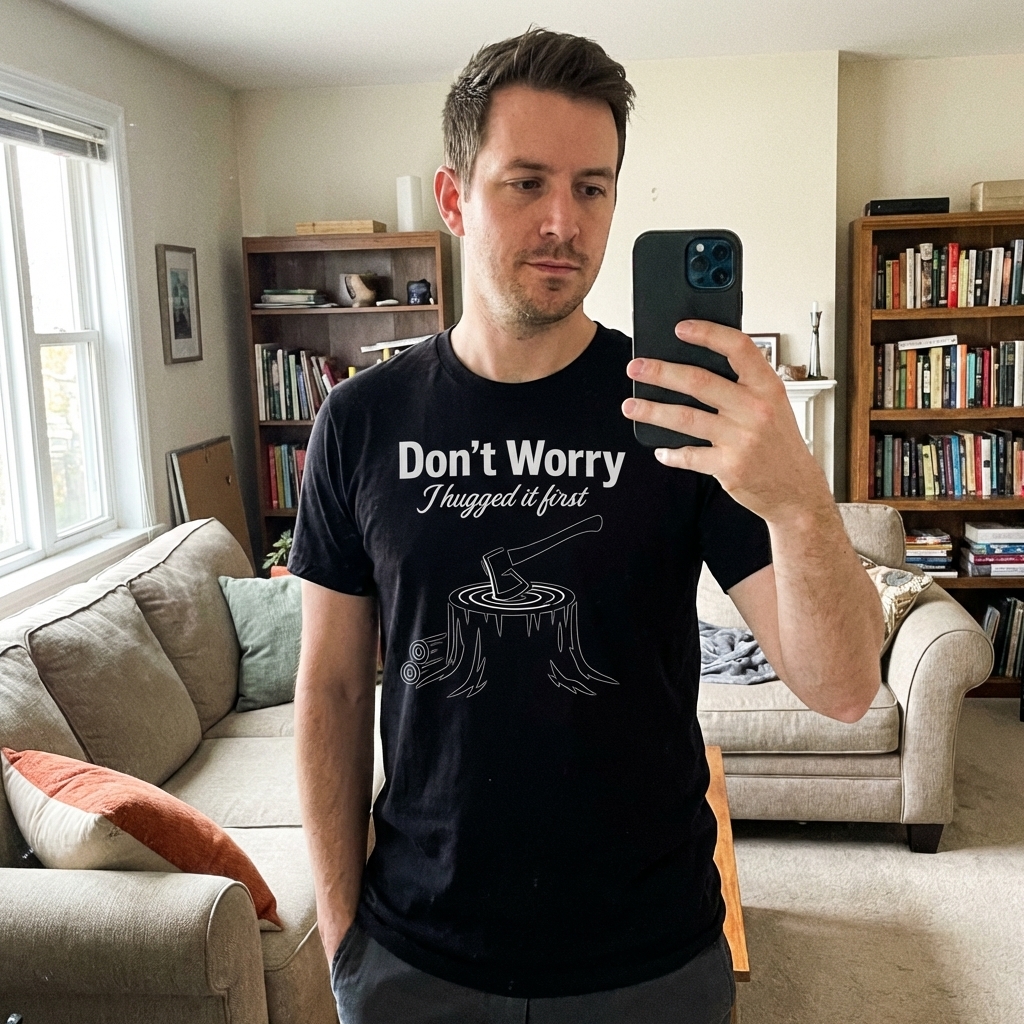 The phrase “Don’t Worry I Hugged It First” is a humorous take on the act of felling trees or processing wood. It playfully suggests a deep, albeit ironic, affection for nature, even when engaged in activities that alter the forest landscape. It speaks to a soft-hearted lumberjack or a mindful outdoor enthusiast.