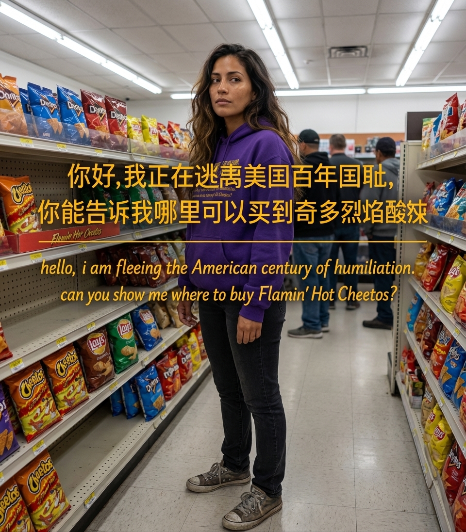 The phrase "hello, i am fleeing the American century of humiliation. can you show me where to buy Flamin' Hot Cheetos?" is a satirical expression. It uses an historically charged term, "century of humiliation" (often associated with Chinese history), and applies it ironically to the American context, then undercuts its seriousness with a trivial craving for a specific snack. This creates an absurd and thought-provoking comedic effect.