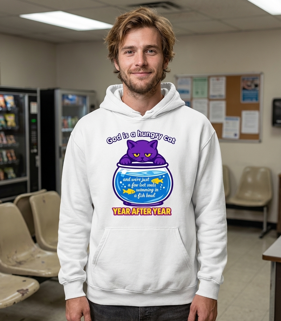 This graphic artwork features a purple cat looking into a fish bowl where two yellow fish, representing 'lost souls,' swim. The design visually represents a metaphorical and cynical view of life under an indifferent, powerful entity, emphasized by the phrase 'YEAR AFTER YEAR'.