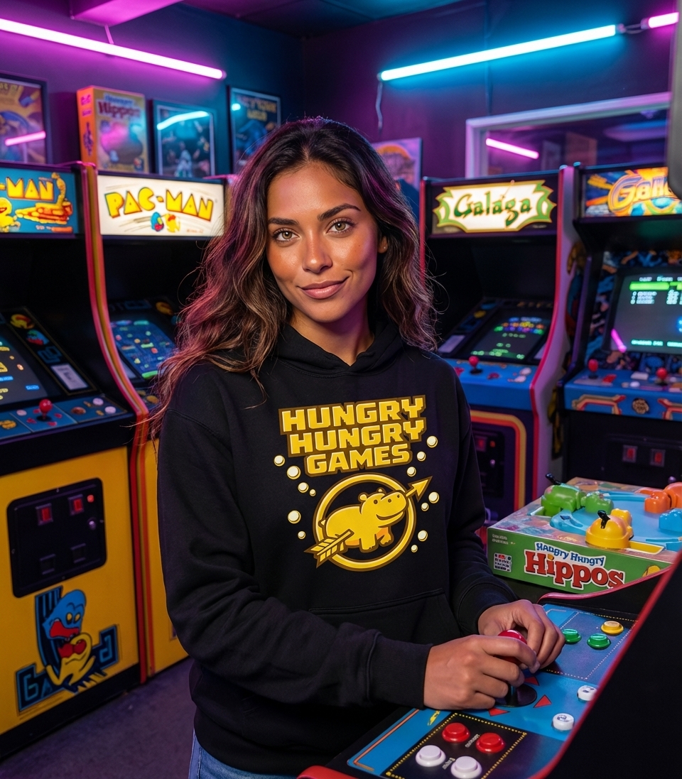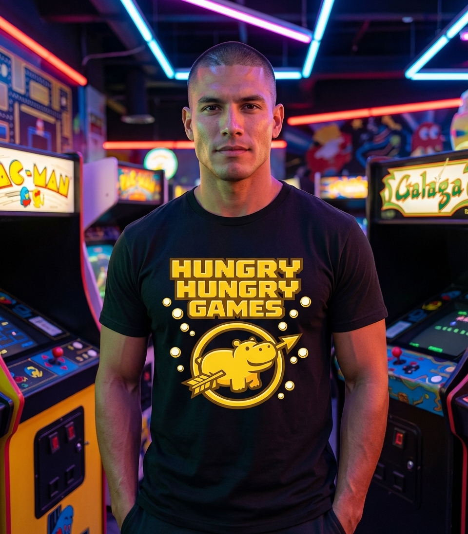 The phrase "Hungry Hungry Games" is a witty mashup, referencing the fast-paced board game "Hungry Hungry Hippos" and the intense "Hunger Games" saga. It combines the playful gluttony of the hippos with the competitive spirit and iconic imagery of the dystopian franchise.