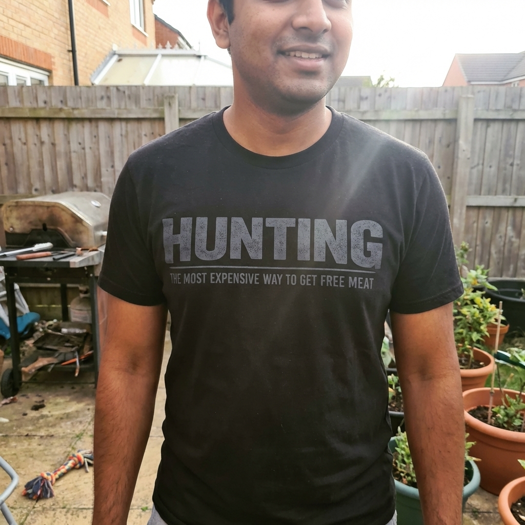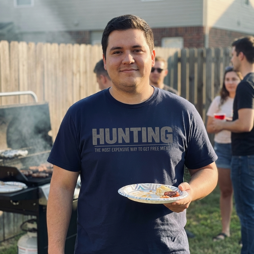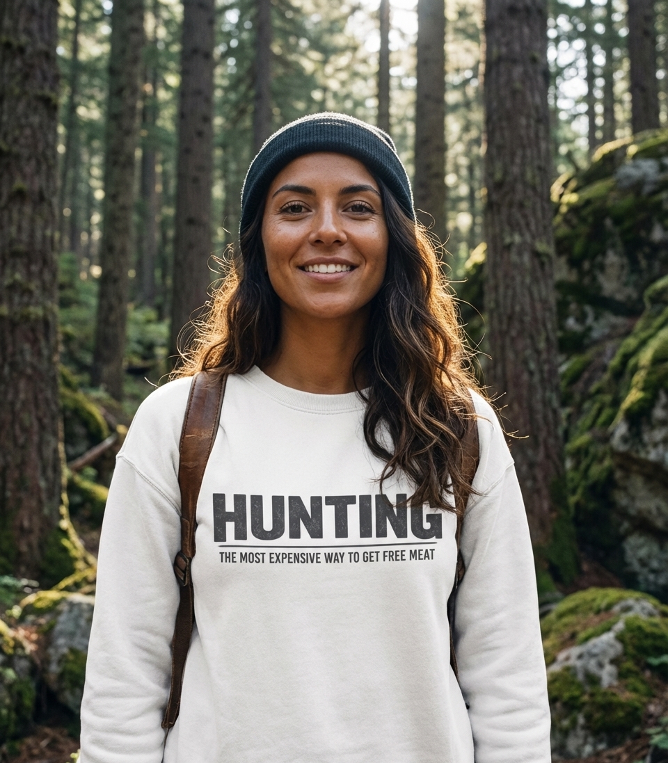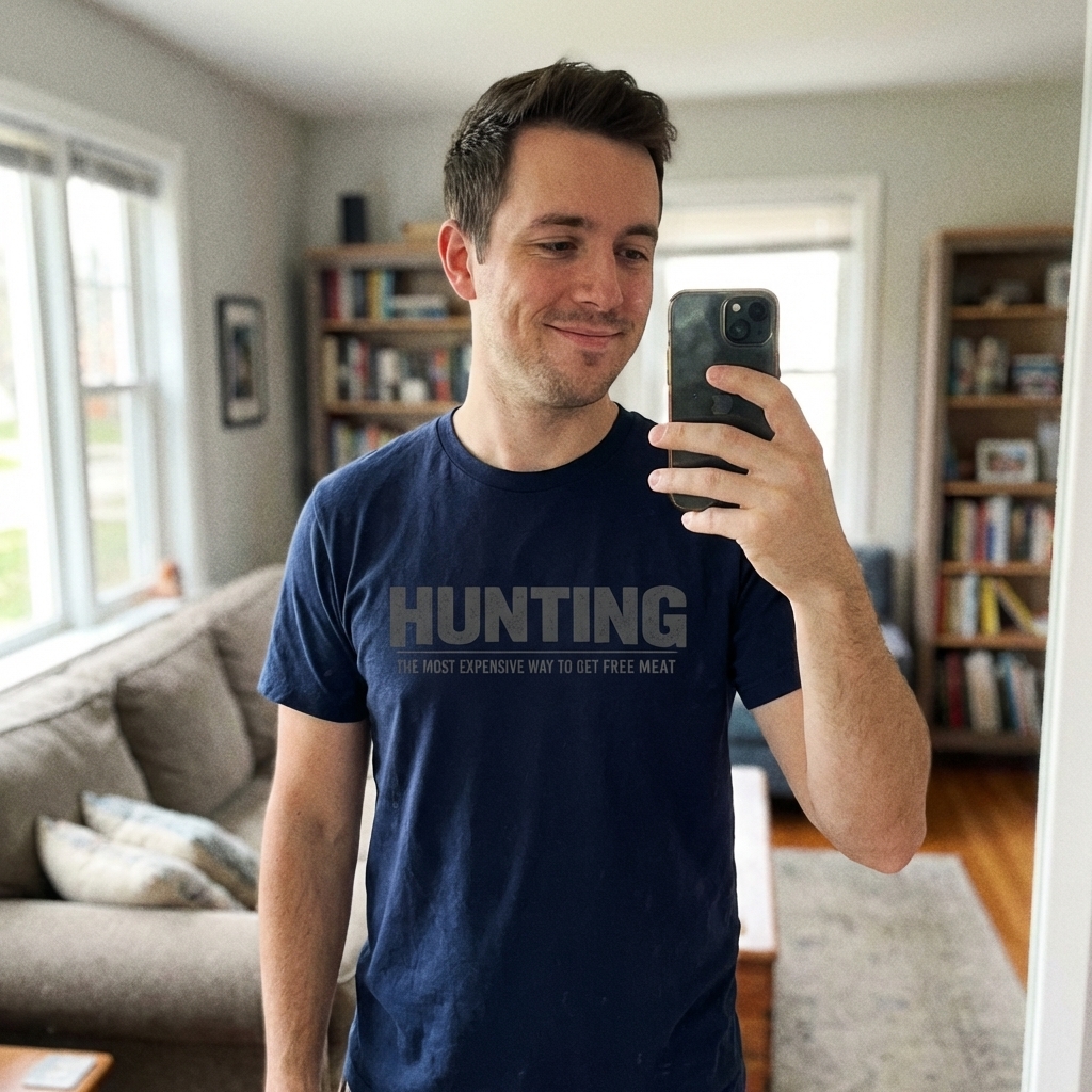 This design cleverly highlights the ironic reality of hunting, where the pursuit of wild game, often considered "free meat," comes with significant investment. It's a witty commentary for those who understand the passion and expenses involved in the sport.