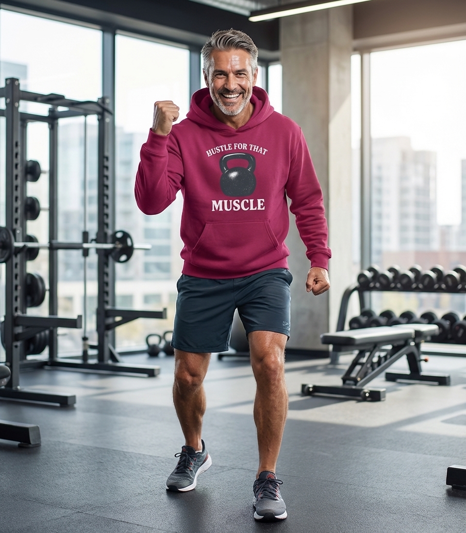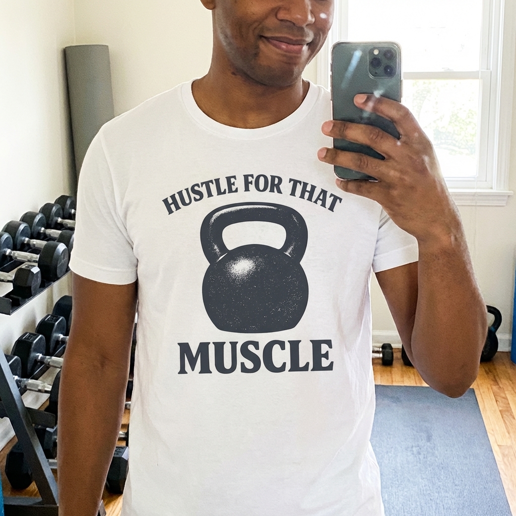 The 'Hustle For That Muscle' phrase captures the lifestyle of passionate fitness enthusiasts who spend their days lifting weights, pushing limits, and chasing gains.