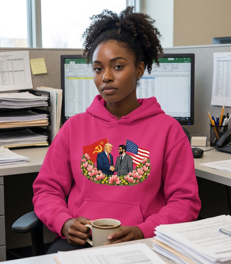 The phrase 'Peace Summit' in this context suggests an event of significant geopolitical reconciliation or dialogue. However, its depiction alongside such ideologically divergent symbols and figures, particularly the Soviet flag, imbues it with a strong sense of irony and satire. The design encourages viewers to consider unusual political alliances or hypothetical future scenarios in a humorous or critical light.