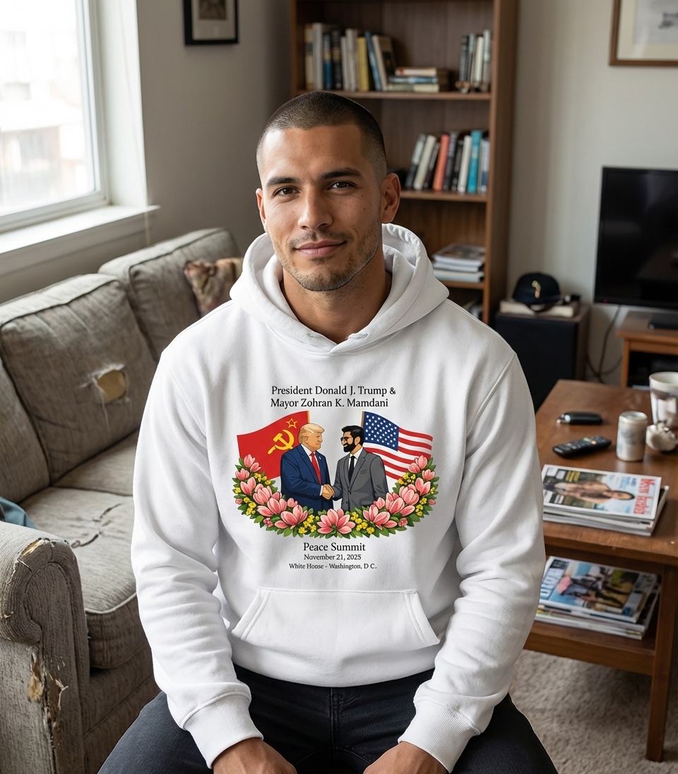 This graphic tee artwork presents a striking, cartoonish illustration of a hypothetical peace summit. It features former US President Donald J. Trump shaking hands with Mayor Zohran K. Mamdani, set against the backdrop of the American flag and the Soviet Union's hammer and sickle flag. The text specifies a 'Peace Summit' on 'November 21, 2025' at the 'White House - Washington, D. C.', framing the scene within a vibrant wreath of flowers.