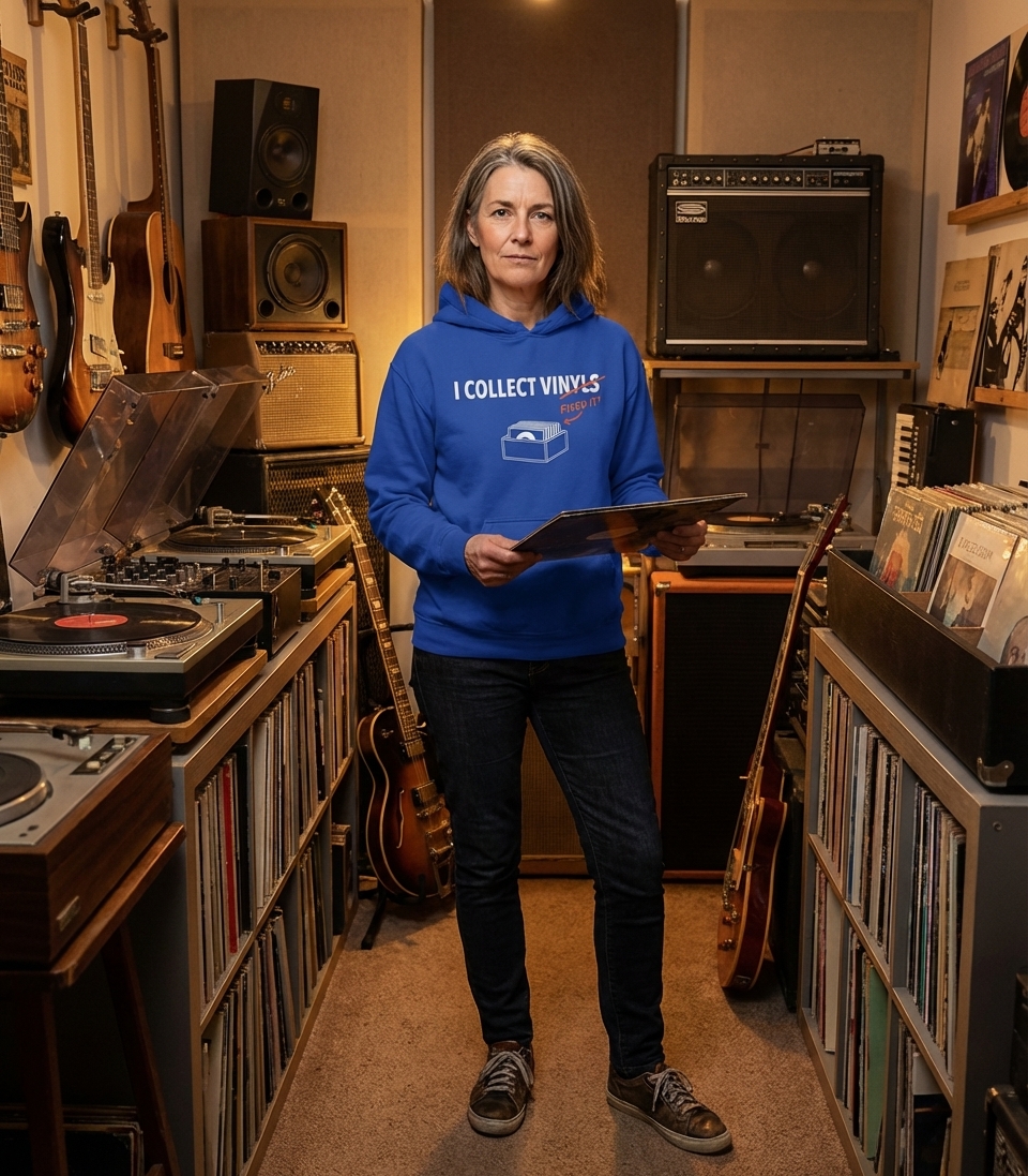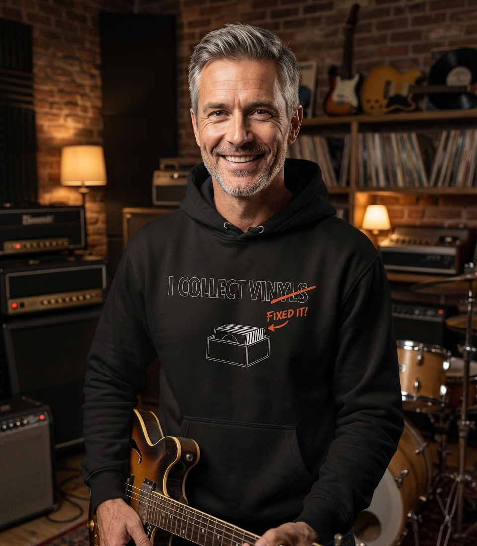 The design playfully pokes fun at this linguistic particularity, making it a relatable inside joke for those deeply involved in the world of analog music.