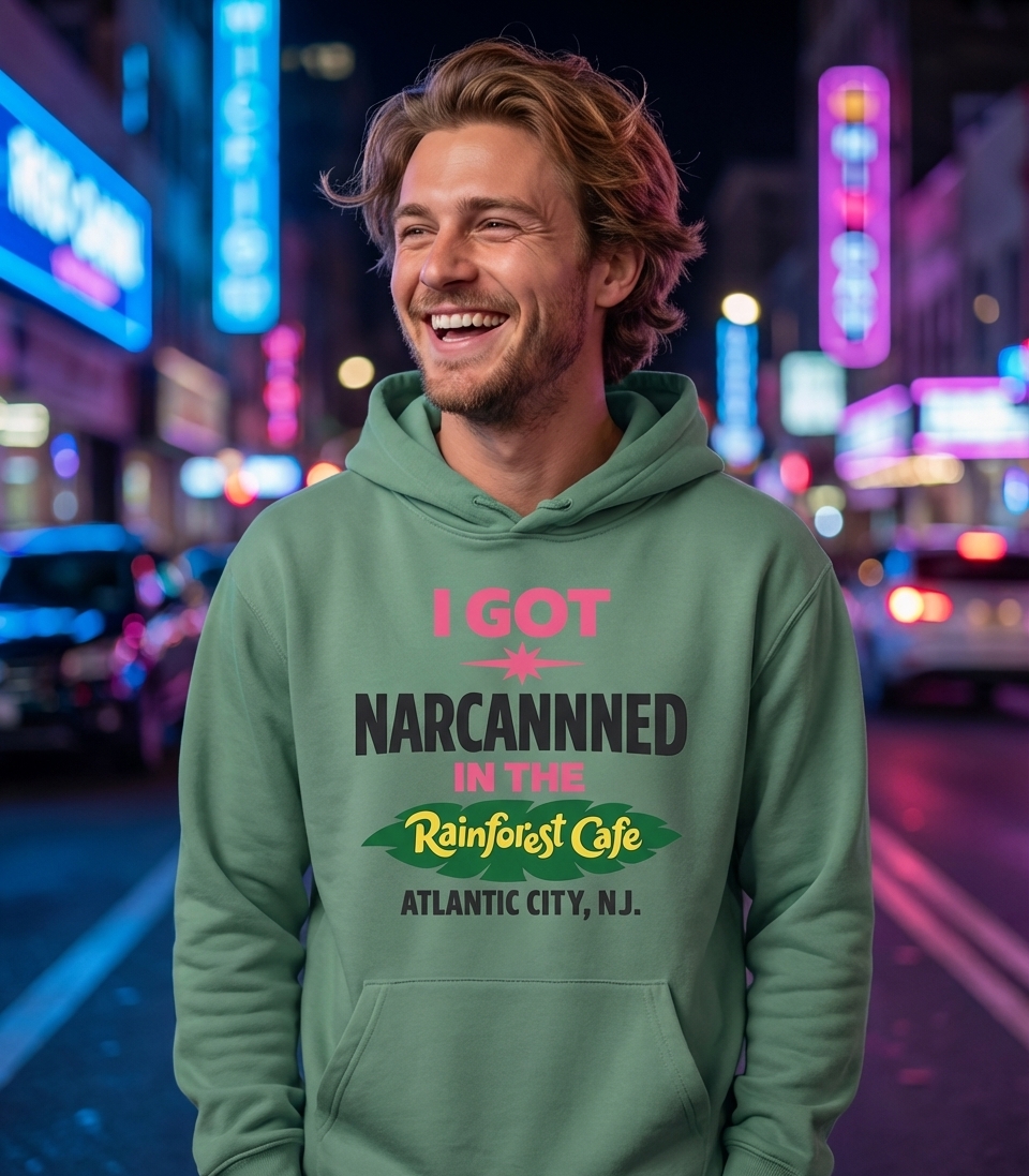 The phrase 'I Got Narcaned' refers to being administered Narcan (naloxone) after an opioid overdose. Placing this serious event in the context of a family-friendly restaurant like Rainforest Cafe in Atlantic City, NJ, creates a jarring and darkly humorous juxtaposition. It's a statement that leverages shock value and irony to comment on societal issues through a comedic lens.