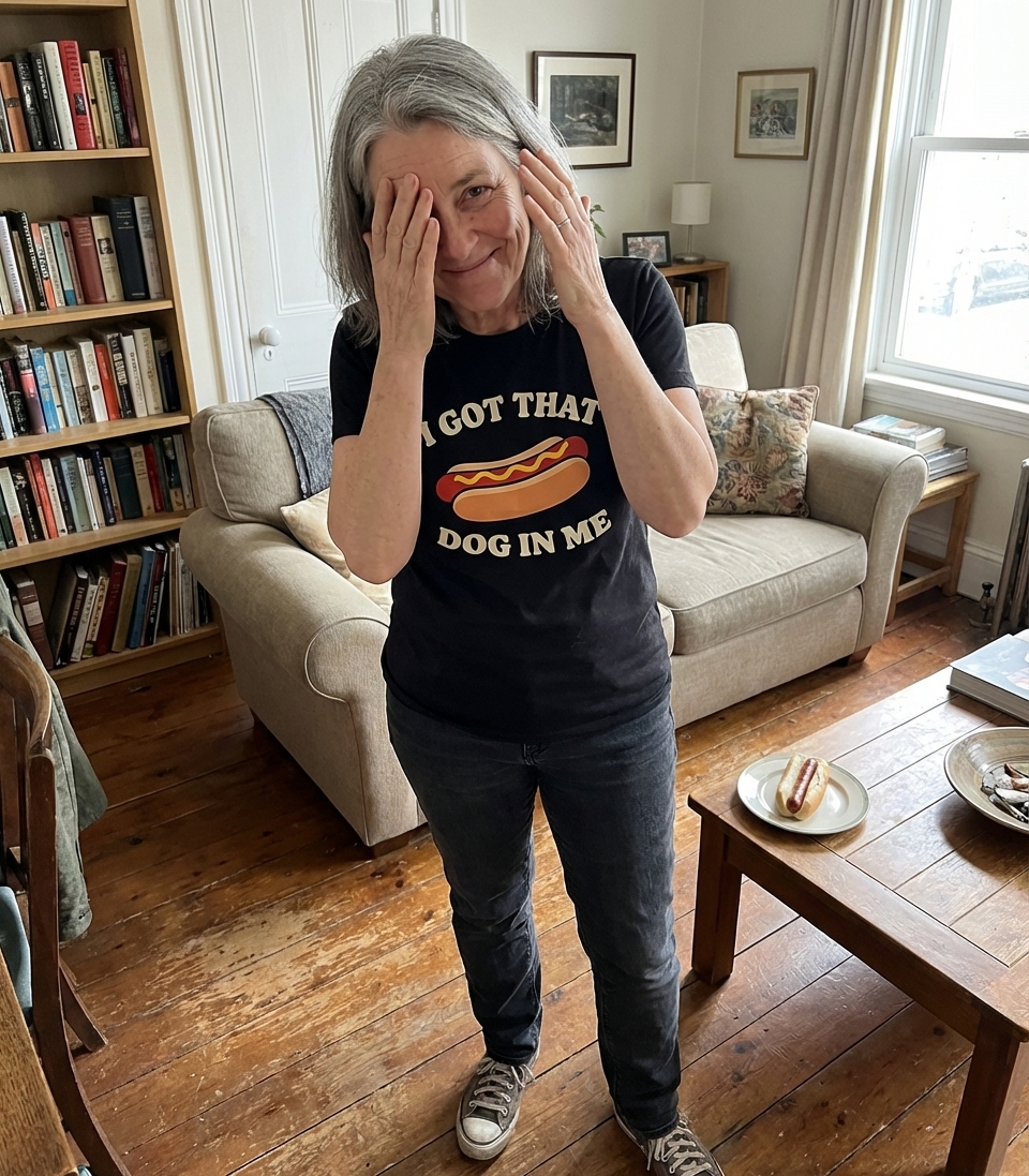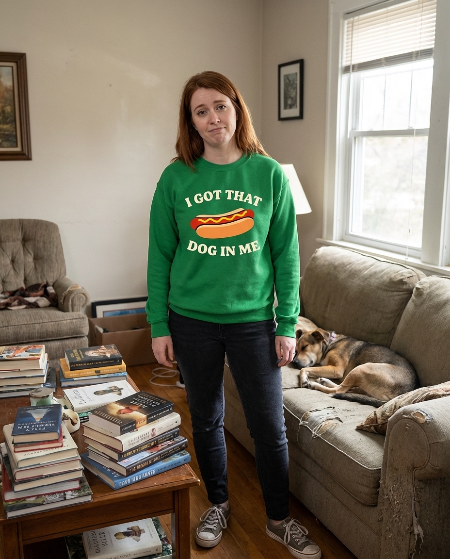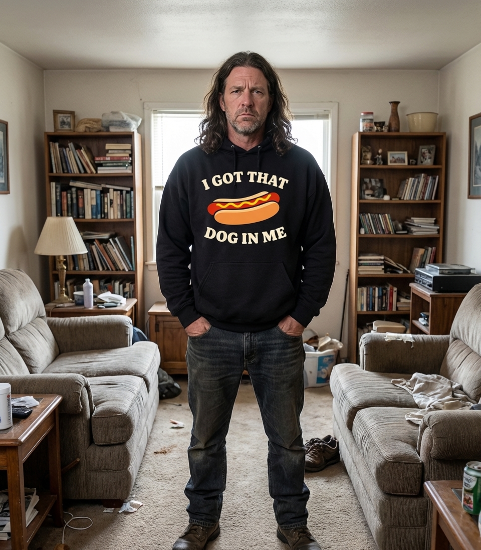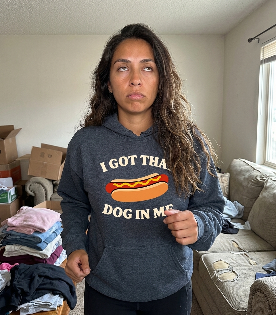 The core phrase "I Got That Dog In Me" is a humorous colloquialism. It playfully suggests a strong appetite, a deep craving, or an intense connection to hot dogs, often used to express a keen desire to eat or enjoy them. It carries a lighthearted, slightly cheeky double entendre, implying enthusiasm and a readiness for a good time.