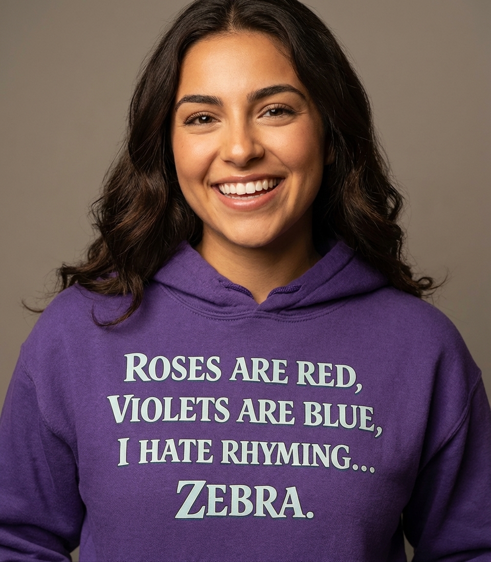 This design cleverly plays on the classic "Roses are Red, Violets are Blue" poem format. It sets up the expectation of a sweet or romantic rhyme, only to subvert it with a perfectly random and humorous non-sequitur. The clean, bold text stands out on any apparel.