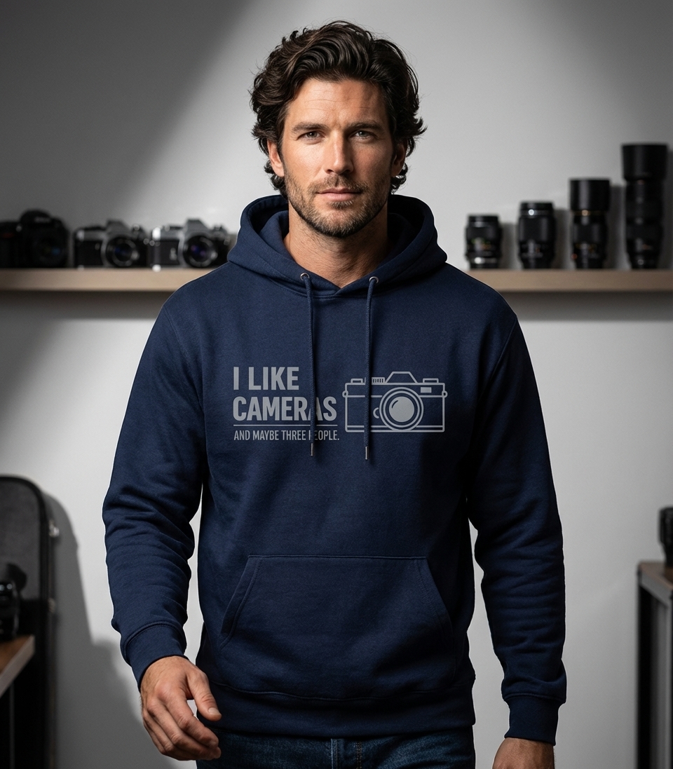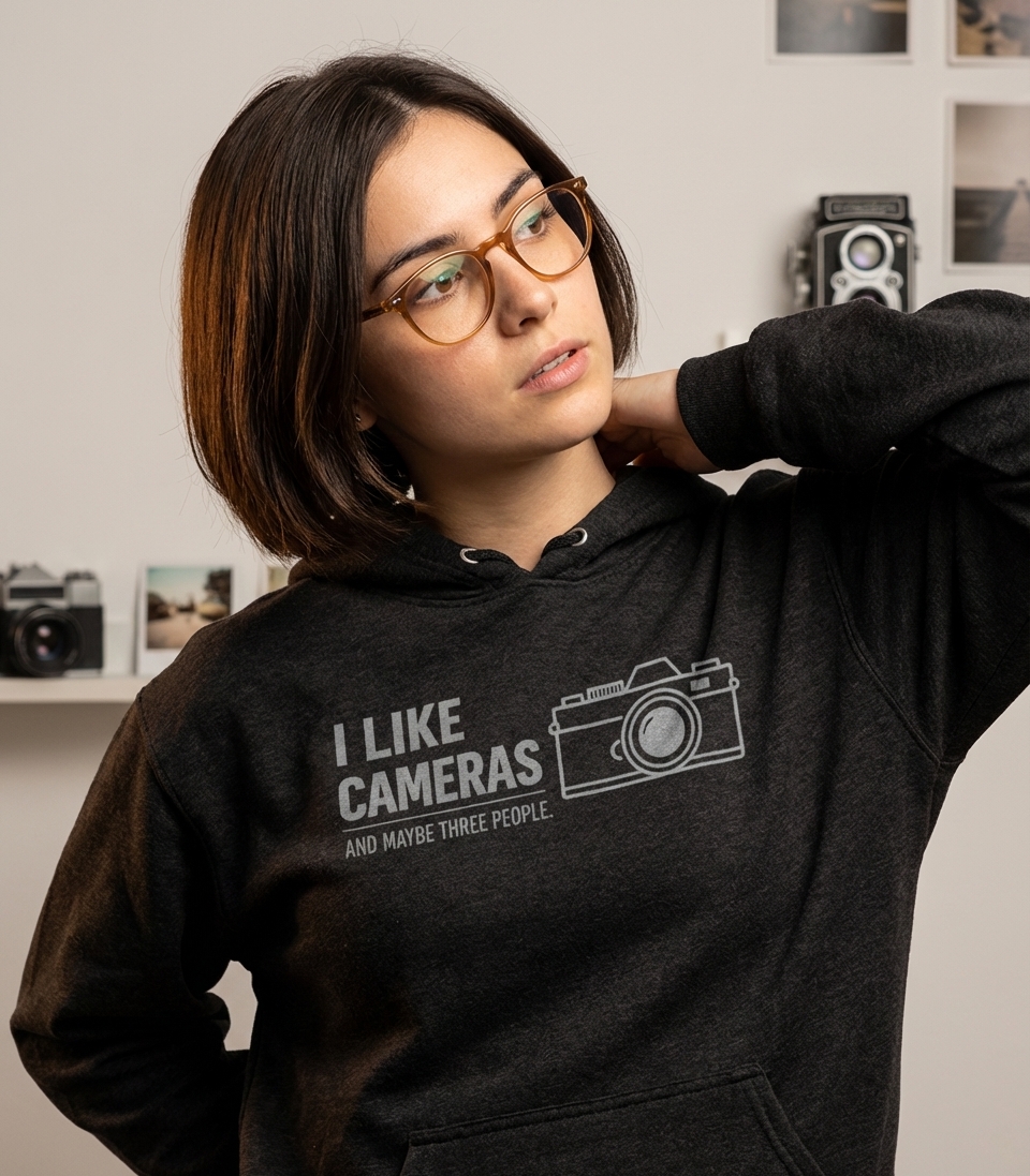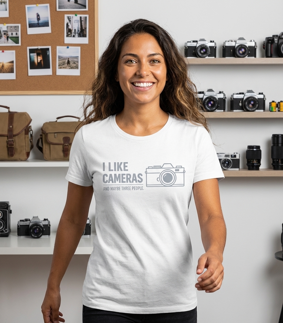 The "I Like Cameras And Maybe Three People" phrase captures the lifestyle of passionate photographers who spend their days capturing moments, appreciating gear, and enjoying a close-knit social circle.