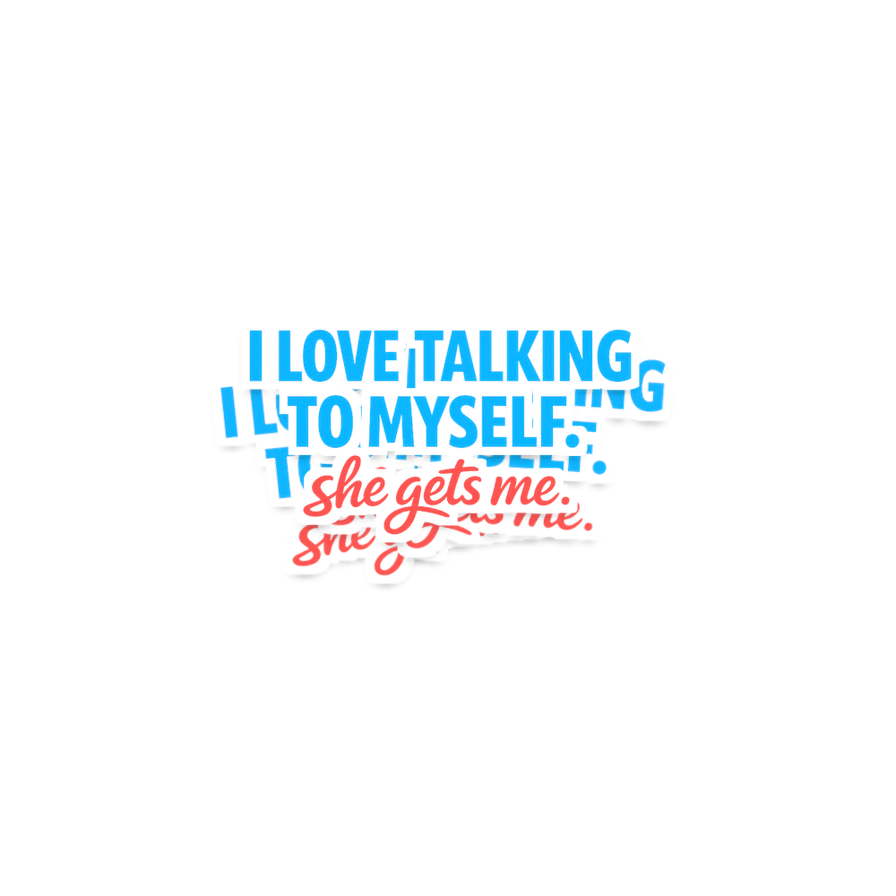 This humorous graphic features the phrase "I LOVE TALKING TO MYSELF. she gets me." presented in two distinct styles. The main declaration is in a bold, sans-serif blue font, while the witty punchline is rendered in a flowing, coral script. The design playfully conveys a deep sense of self-understanding set against a stark black background.