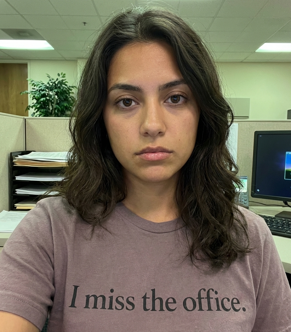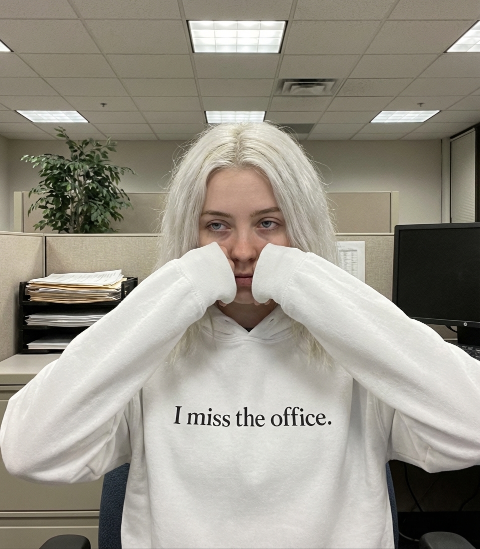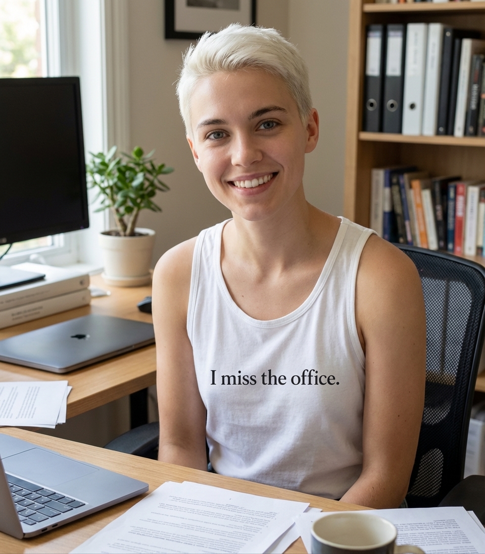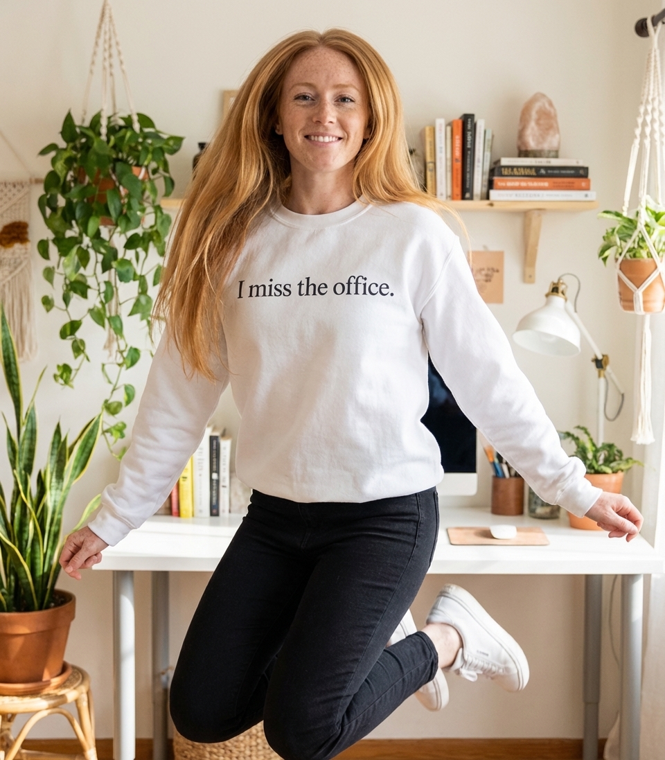 This design features a straightforward text graphic expressing a common sentiment among those who have experienced working remotely. It reflects a wistful longing for the physical office space and the structured environment it provides.