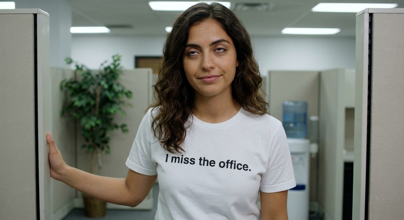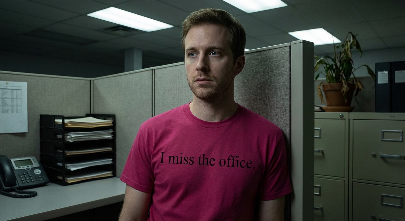 The 'I miss the office' phrase captures the sentiment of professionals who long for the daily routines, social interactions, and dedicated workspace of their traditional office environment.