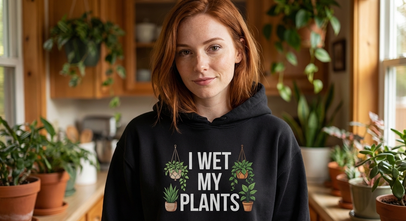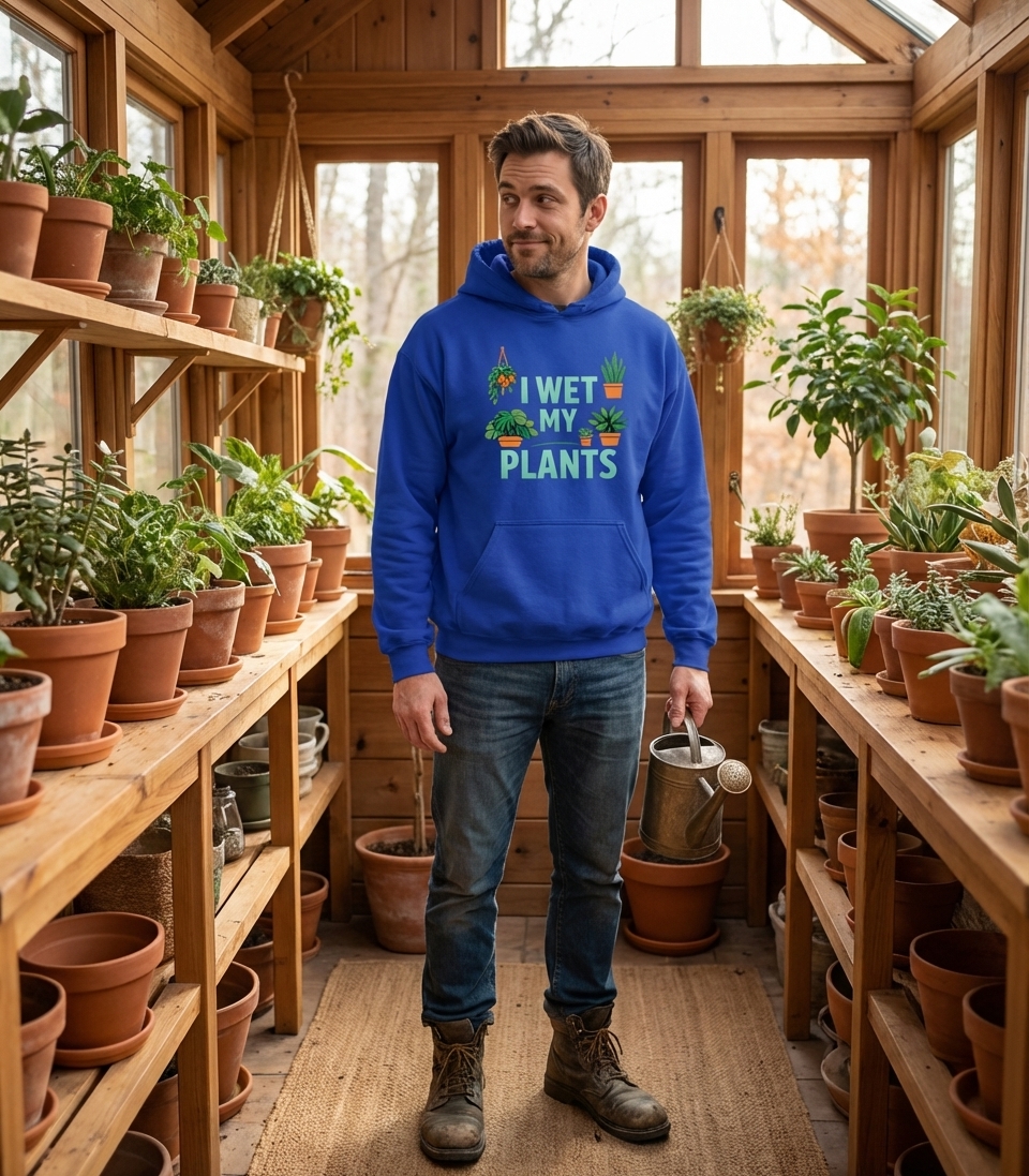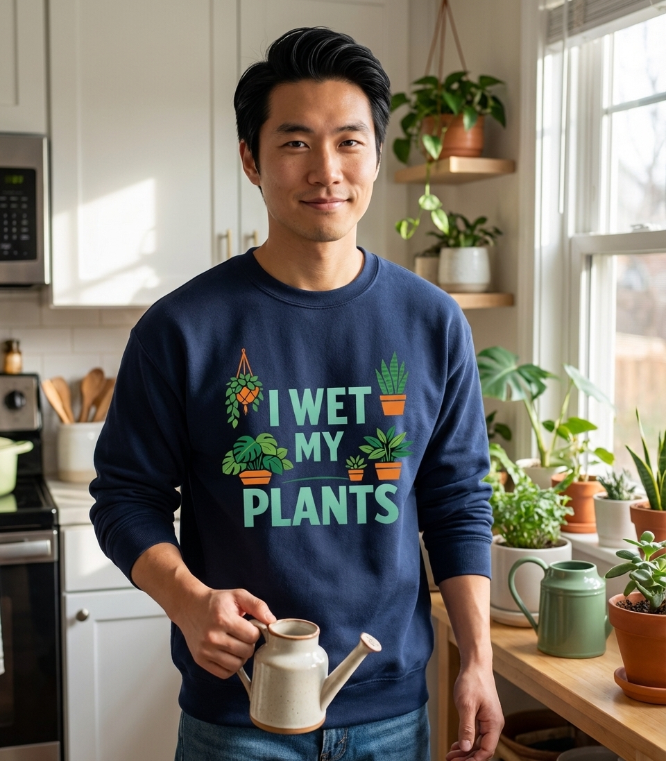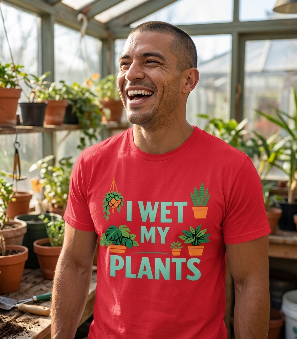 The 'I Wet My Plants' phrase captures the lifestyle of passionate gardeners who spend their days nurturing greenery, expanding their indoor jungle, and appreciating nature's beauty.