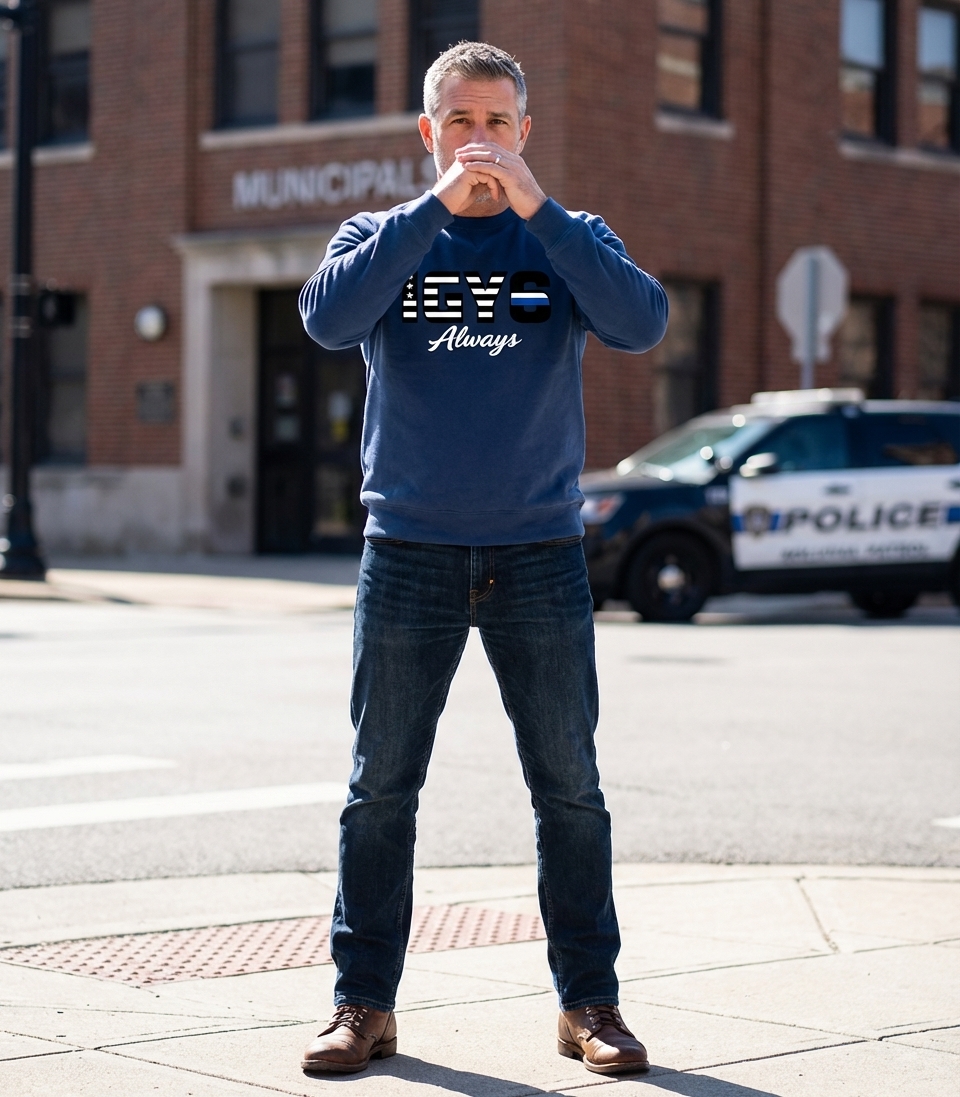 The design features bold, block lettering for "IGYS" with a subtle striped texture, creating a robust, flag-like appearance. The 'S' subtly incorporates a vibrant blue line, symbolizing law enforcement. The cursive "Always" in matching blue provides a personal, heartfelt touch. The overall mood is one of solid support and steadfast commitment.