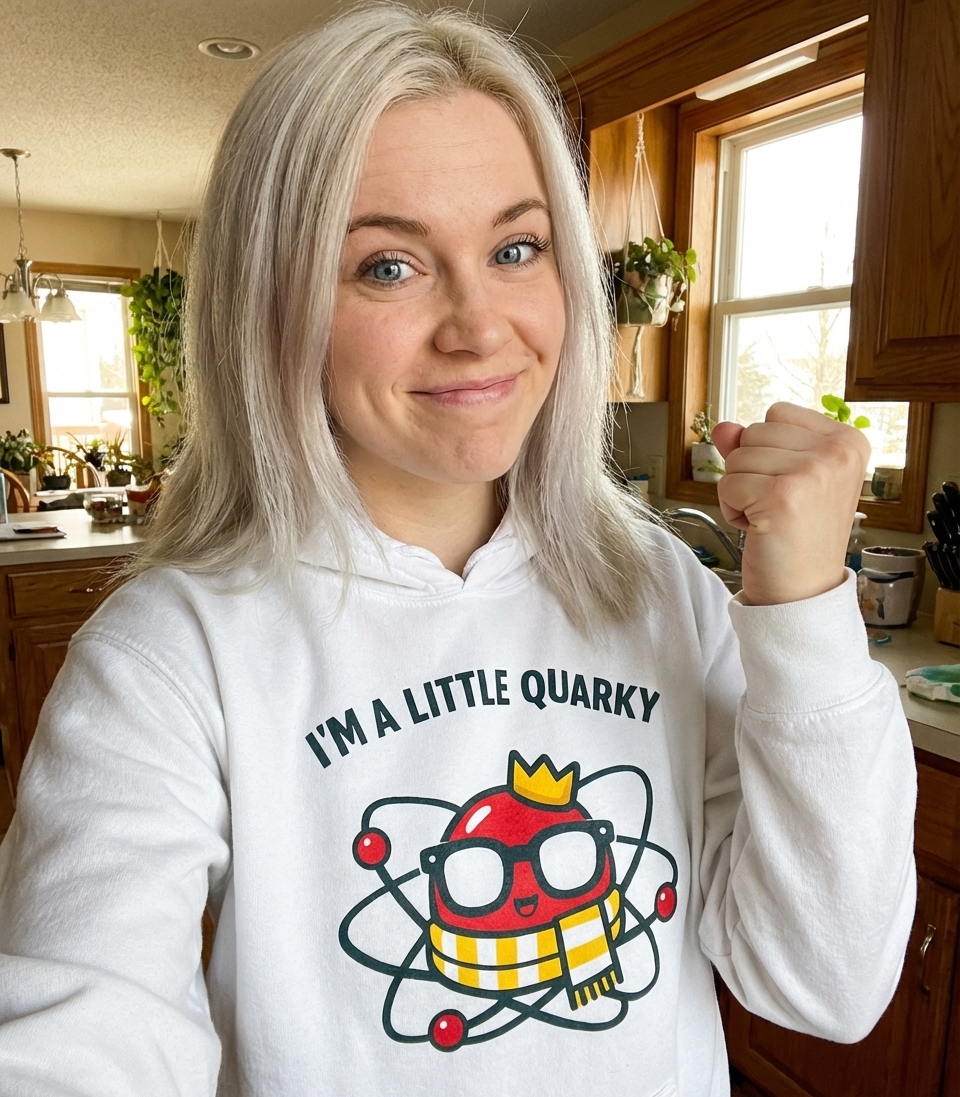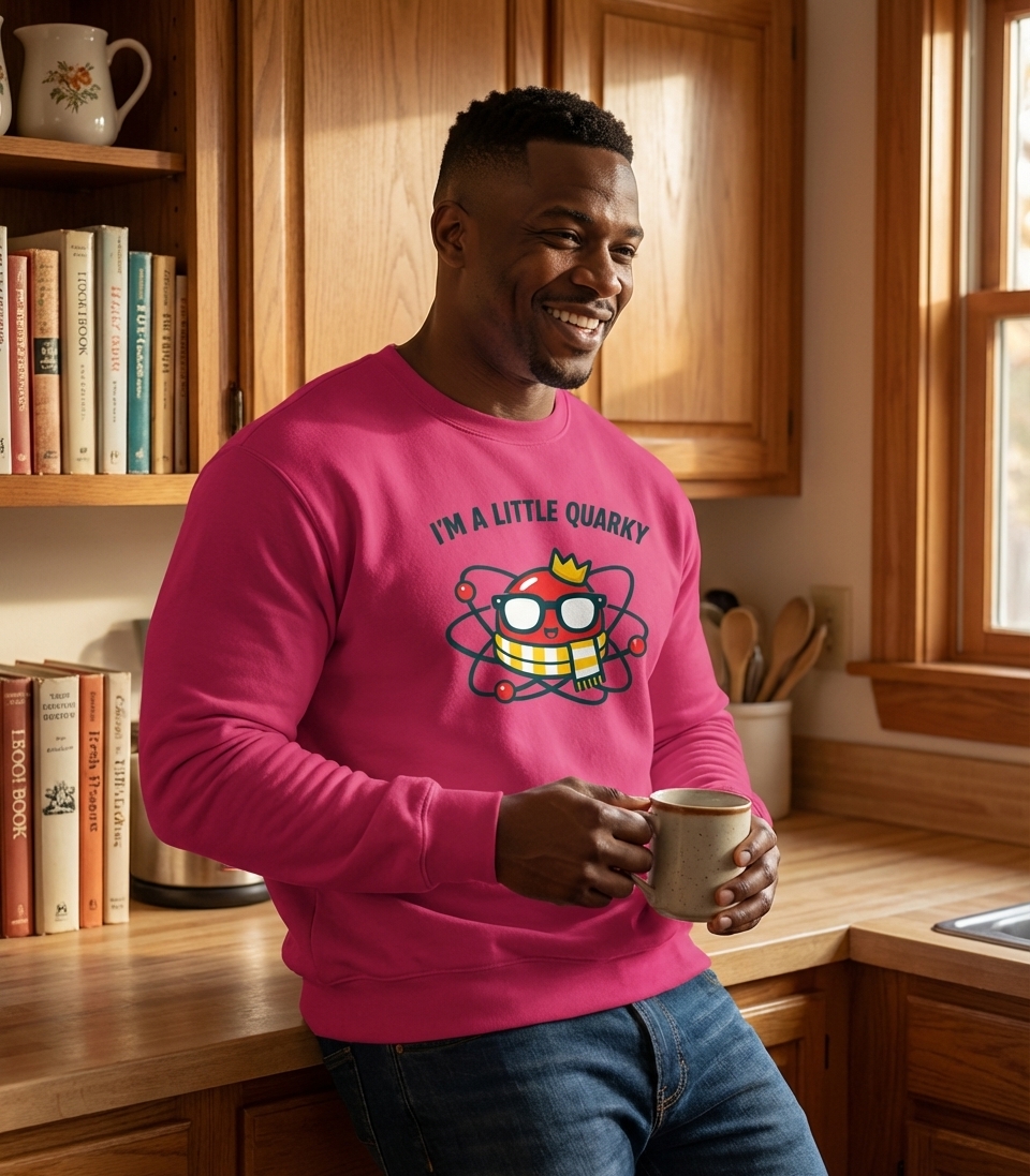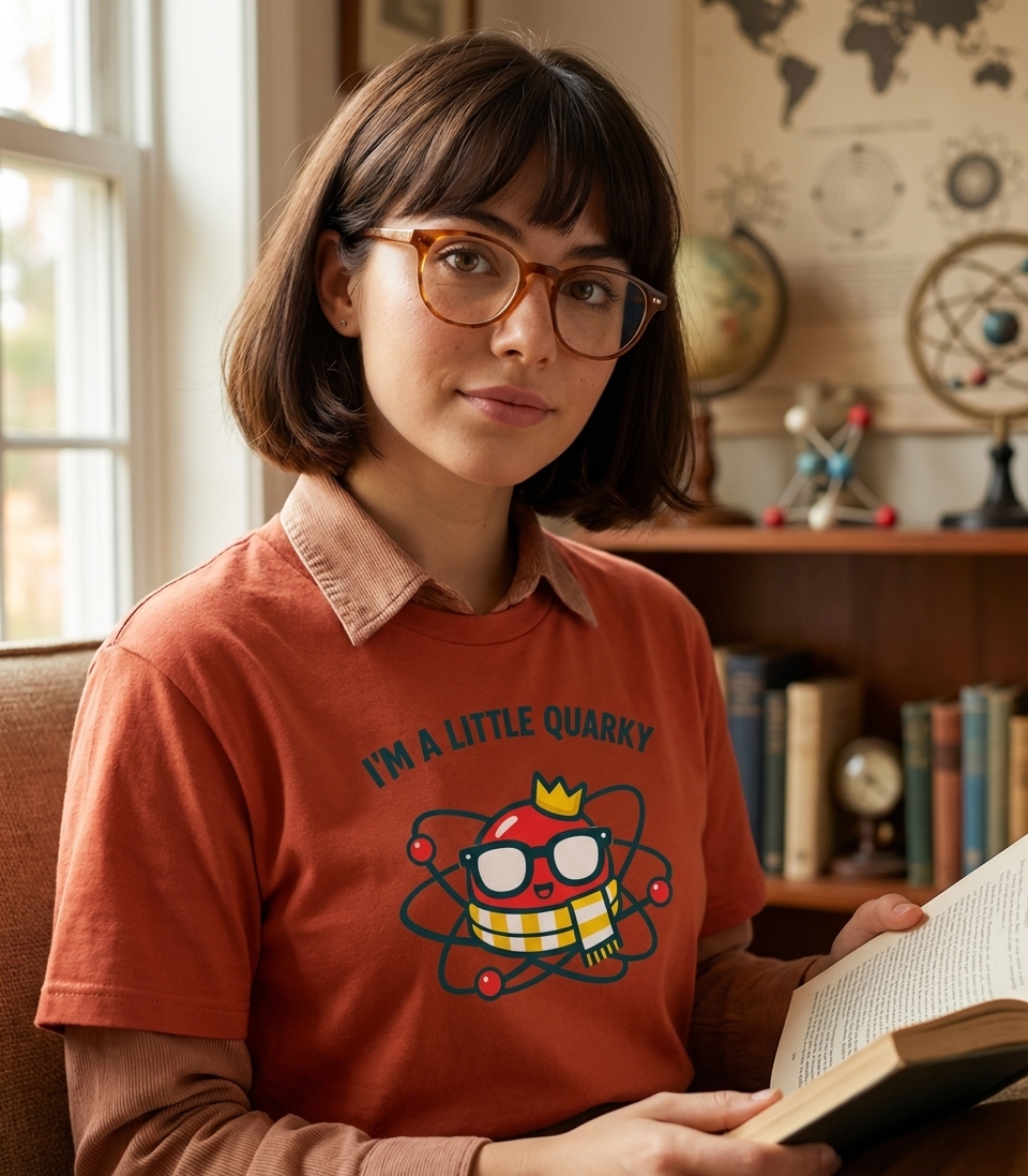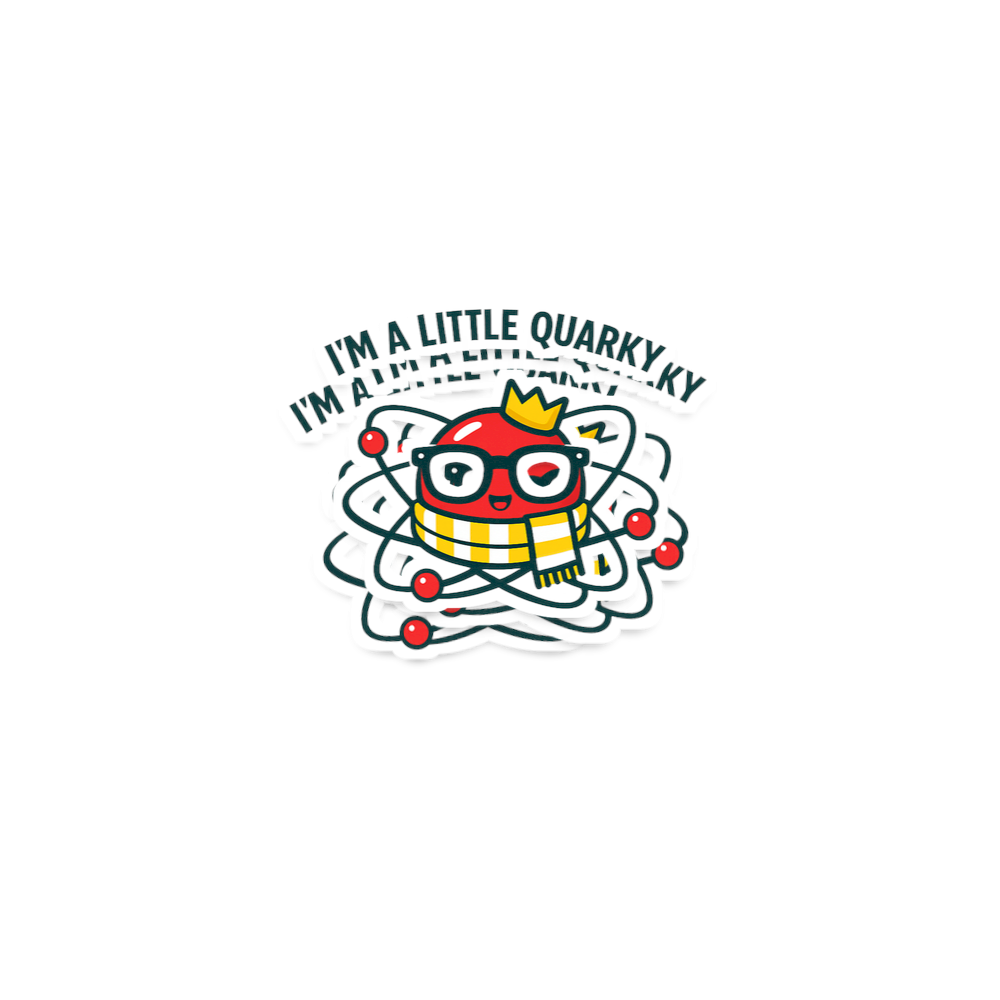 The phrase "I'm A Little Quarky" is a playful pun on the word "quirky," meaning peculiar or unconventional, and "quark," a fundamental particle in physics. It cleverly suggests a personality that is unique and deeply rooted in scientific understanding.