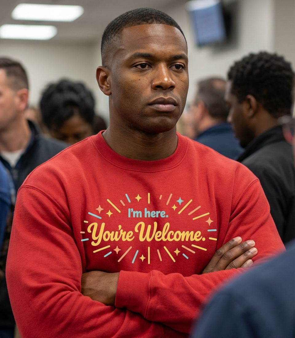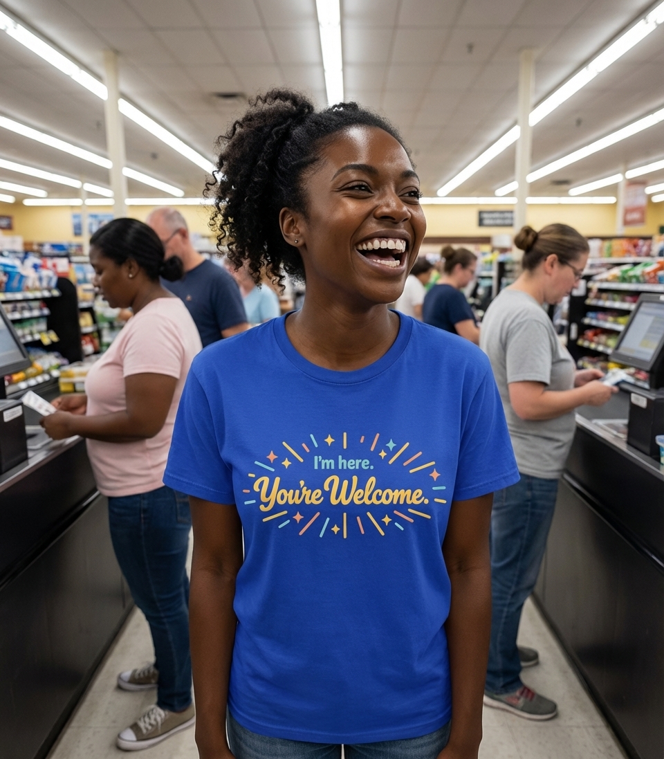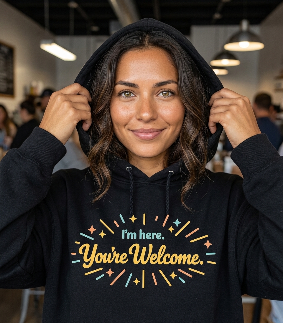 The "I'm here. You're Welcome." phrase captures the lifestyle of confident individuals who know their worth, aren't afraid to show up, and bring a playful, self-assured vibe to any situation.