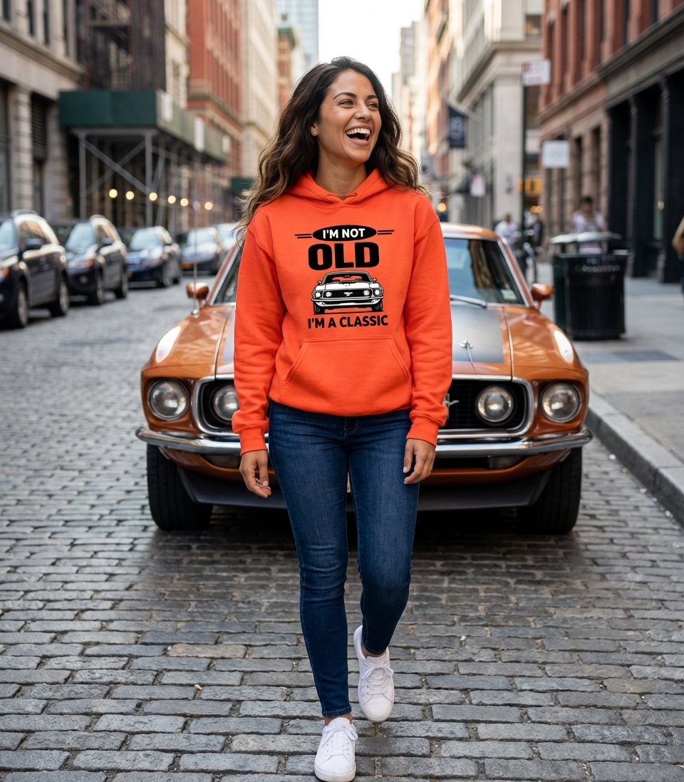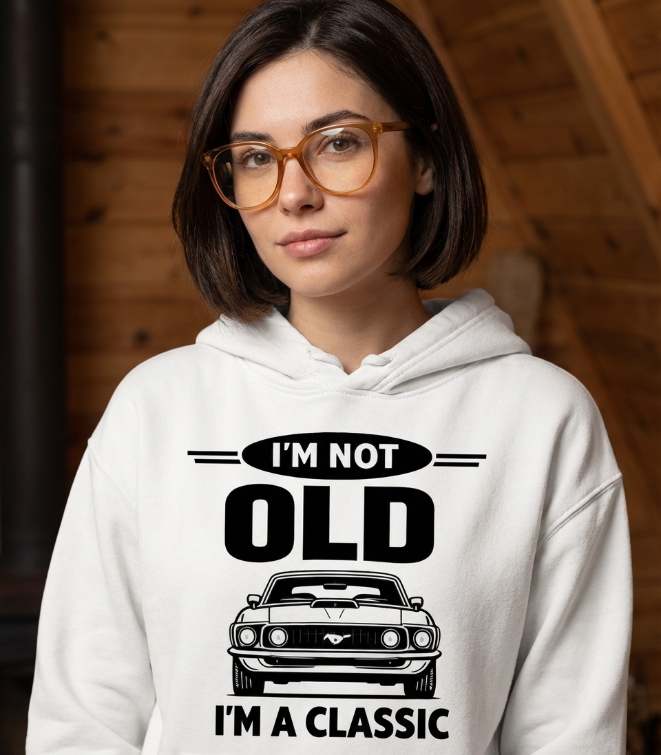 The phrase "I'M NOT" combined with a bold illustration captures the unique spirit of classic American car enthusiasts and their inside jokes.