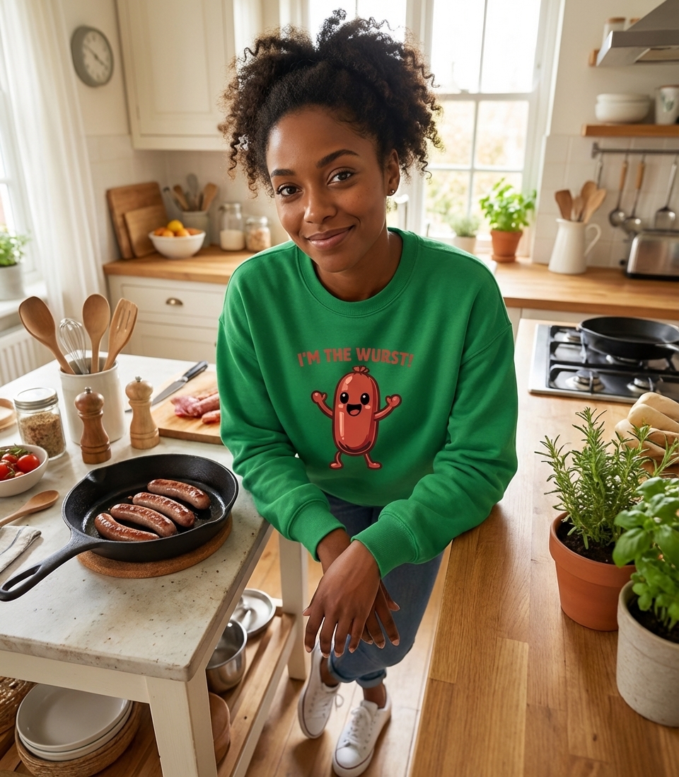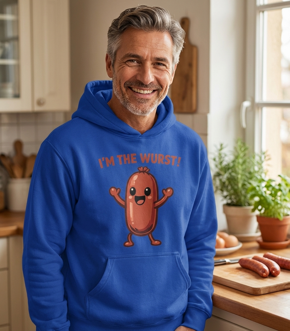 The phrase "I'M THE WURST!" is a humorous play on words, combining the German term "Wurst" (meaning sausage) with the English word "worst" (implying being the least good). This clever pun creates a self-deprecating yet endearing statement, celebrating a love for sausages with a witty twist.