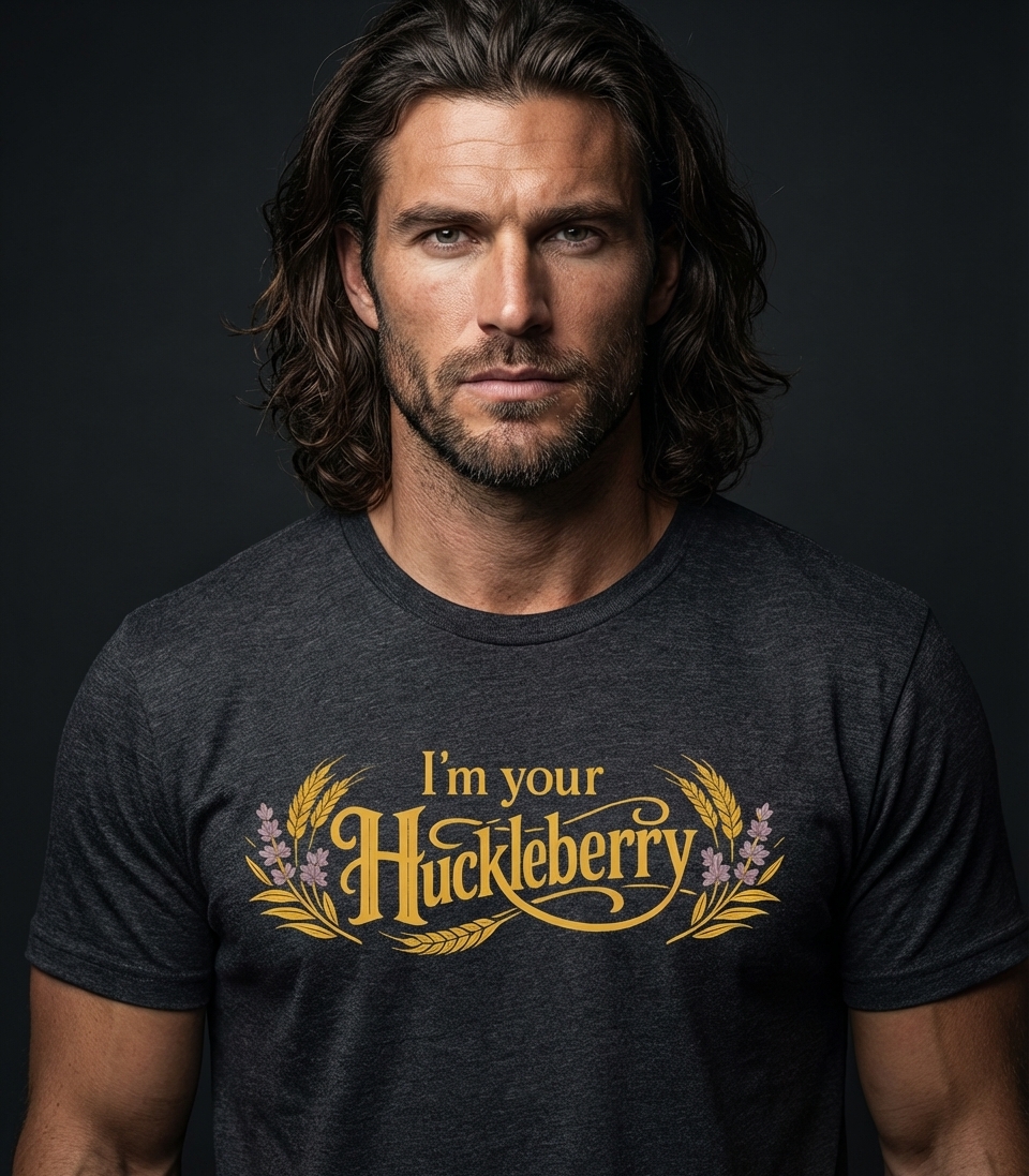 This design features the iconic phrase "I'm your Huckleberry" in a vintage, ornate script. It is elegantly framed by decorative elements resembling wheat stalks and delicate lavender flowers. The artwork evokes a rustic and timeless aesthetic, perfect for those who appreciate classic charm.