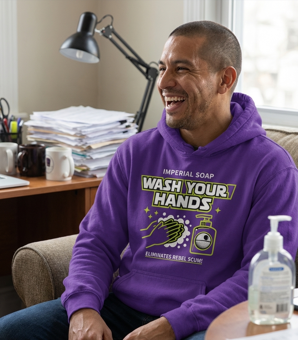 The 'Imperial Soap Wash Your Hands' phrase captures the lifestyle of dedicated sci-fi fans who enjoy unique humor, keeping clean, and a galaxy far, far away.