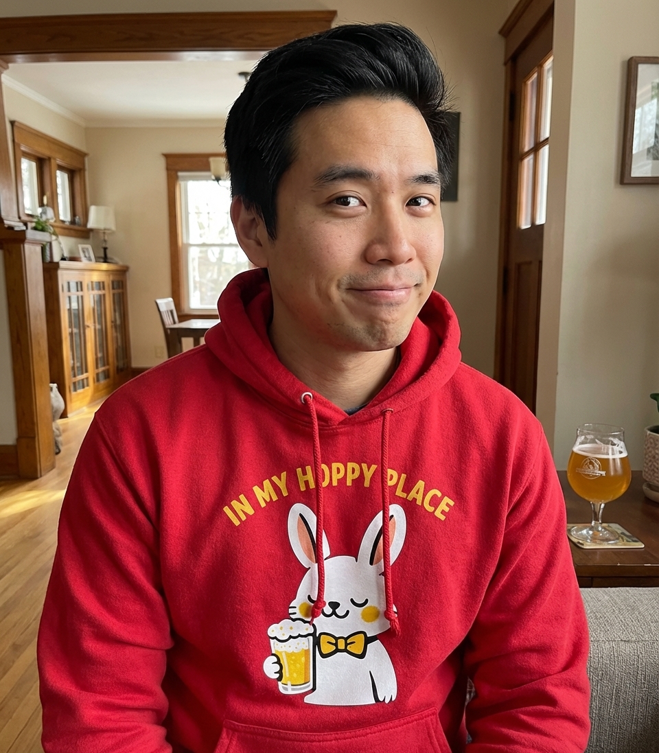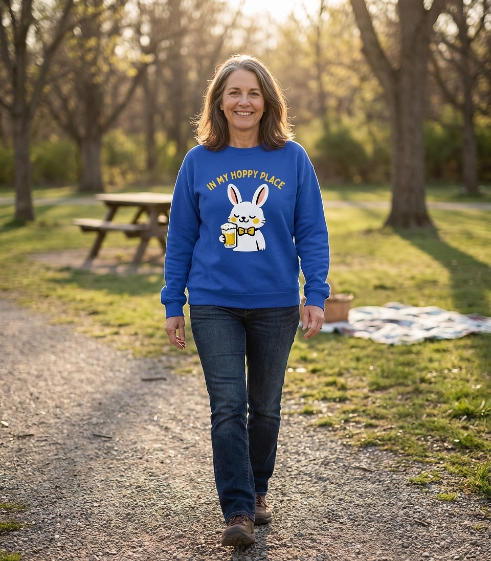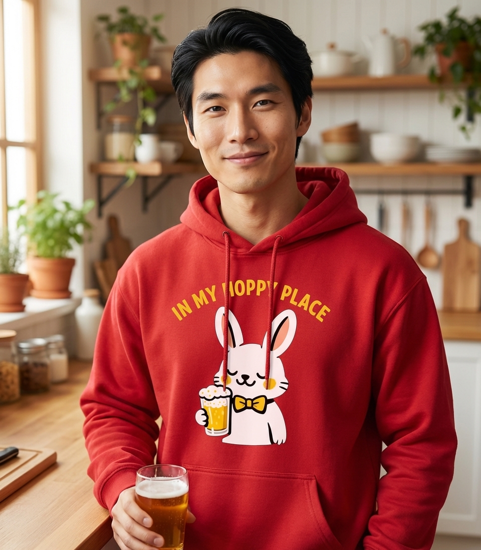 The phrase 'In My Hoppy Place' is a clever play on words, combining 'happy place' with 'hoppy', referencing the hops used in beer brewing and a bunny's natural hopping. It signifies a state of ultimate relaxation and enjoyment, particularly for those who appreciate a good brew.