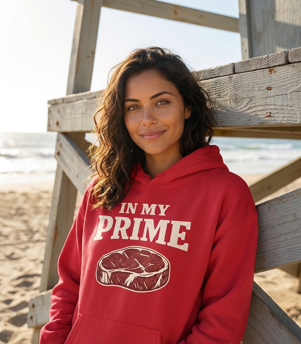 The phrase "In My Prime" signifies being at the best stage of one's life, full of vitality and at the peak of abilities. When paired with the image of a premium steak, it adds a humorous twist, celebrating both personal excellence and the appreciation for fine meat.