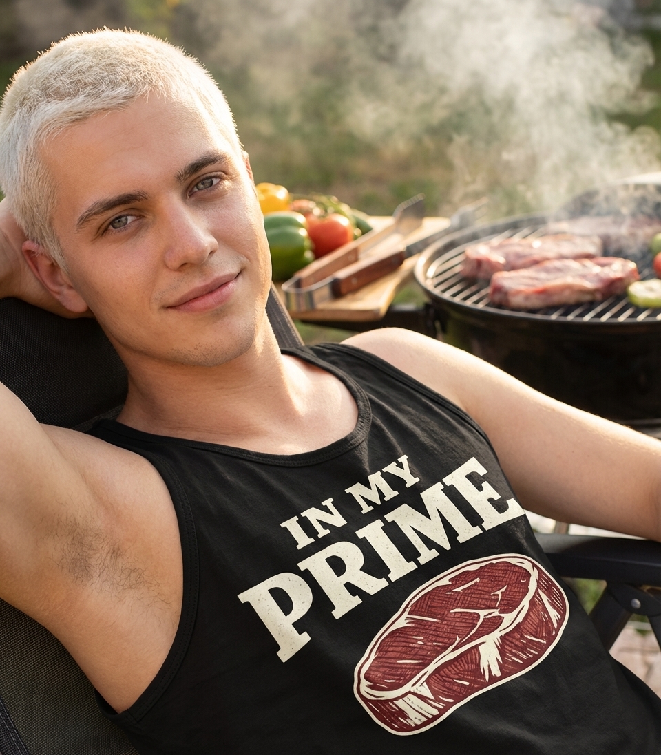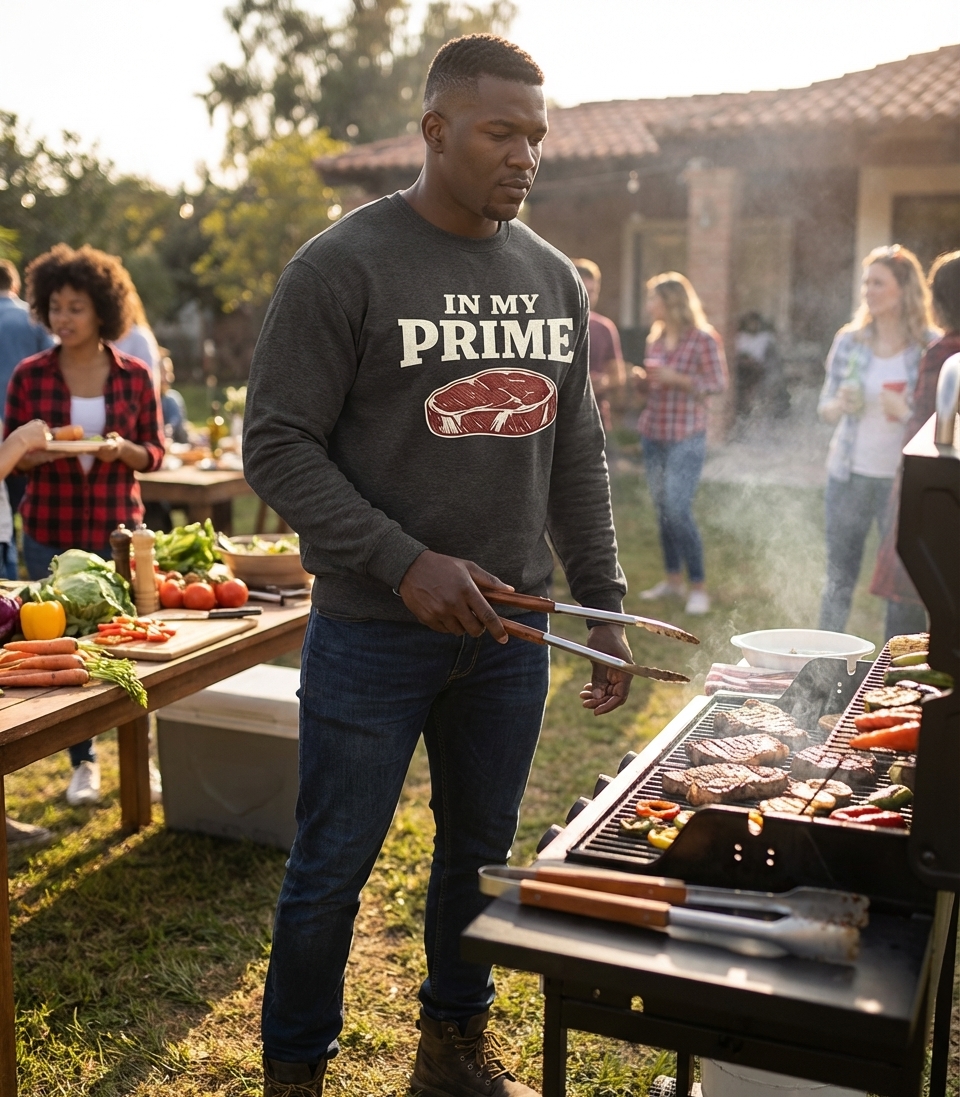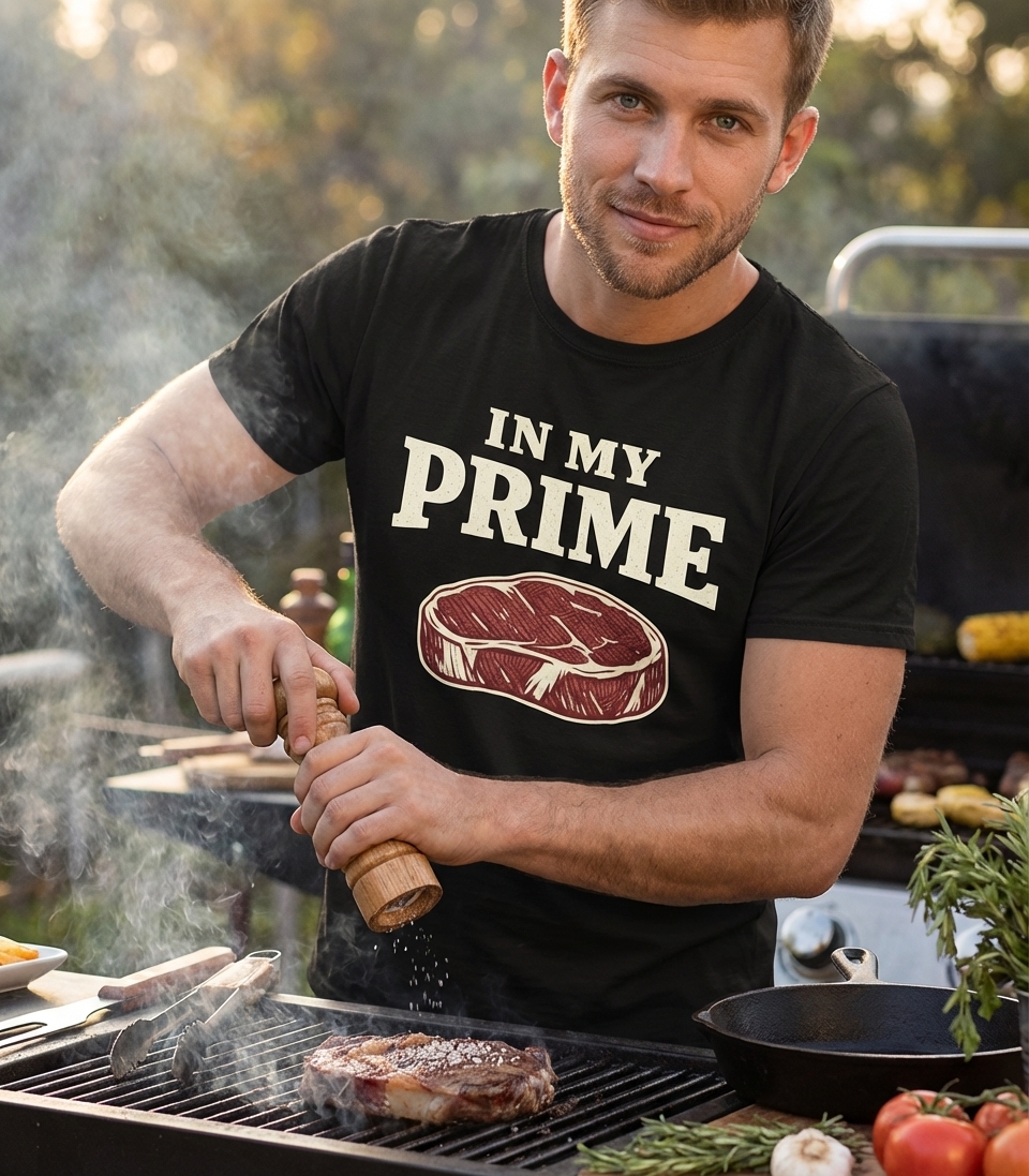 The "In My Prime" phrase captures the lifestyle of passionate meat lovers who enjoy grilling, cooking, and showcasing their best.