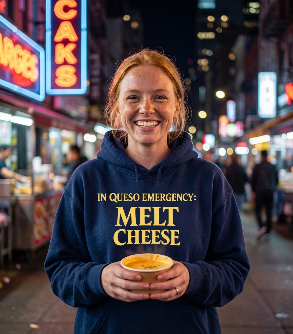 The phrase is a pun on "in case of emergency," substituting "case of" with "queso," the Spanish word for cheese. It humorously implies that when life throws a challenge, the immediate and most effective response is to melt cheese, presumably to make delicious queso.