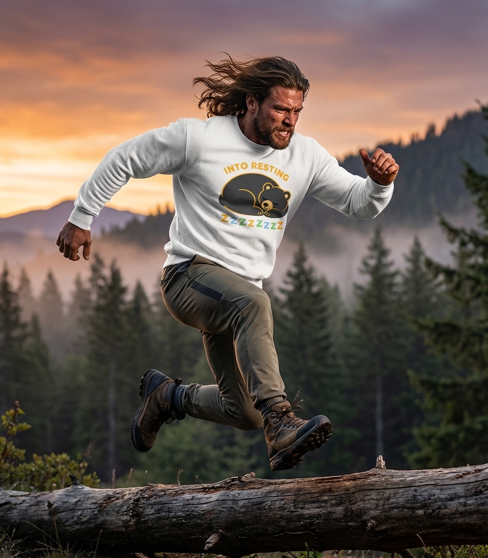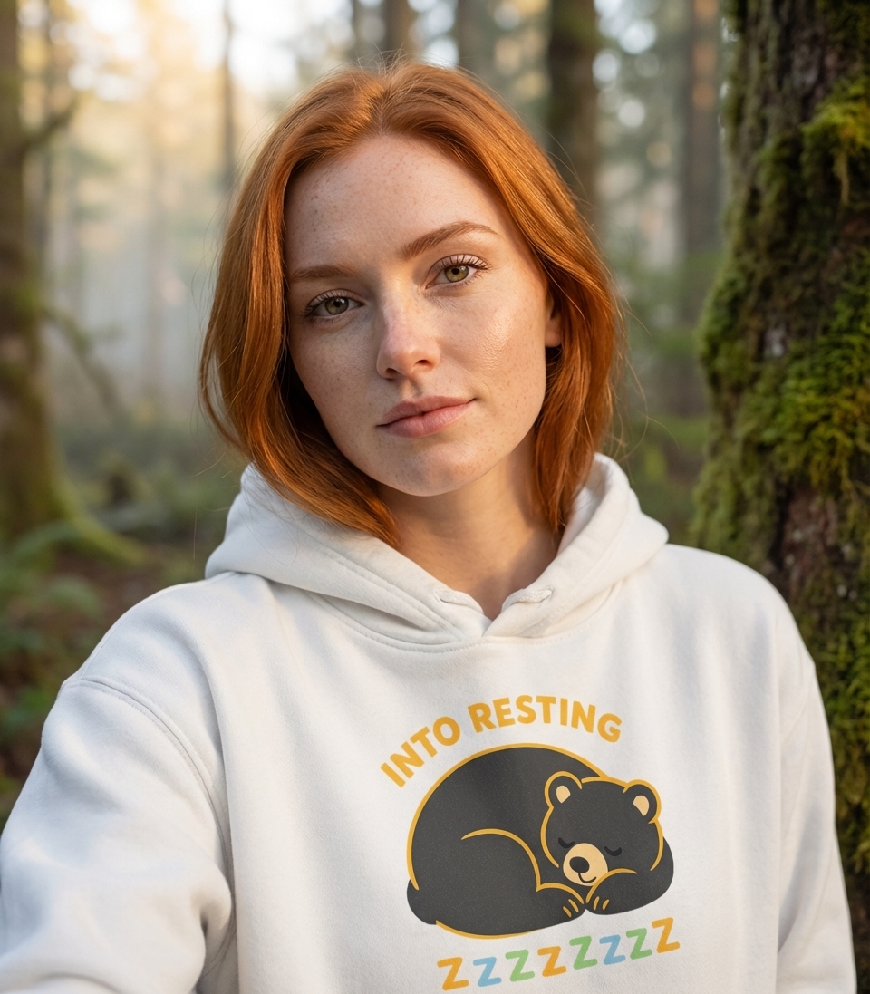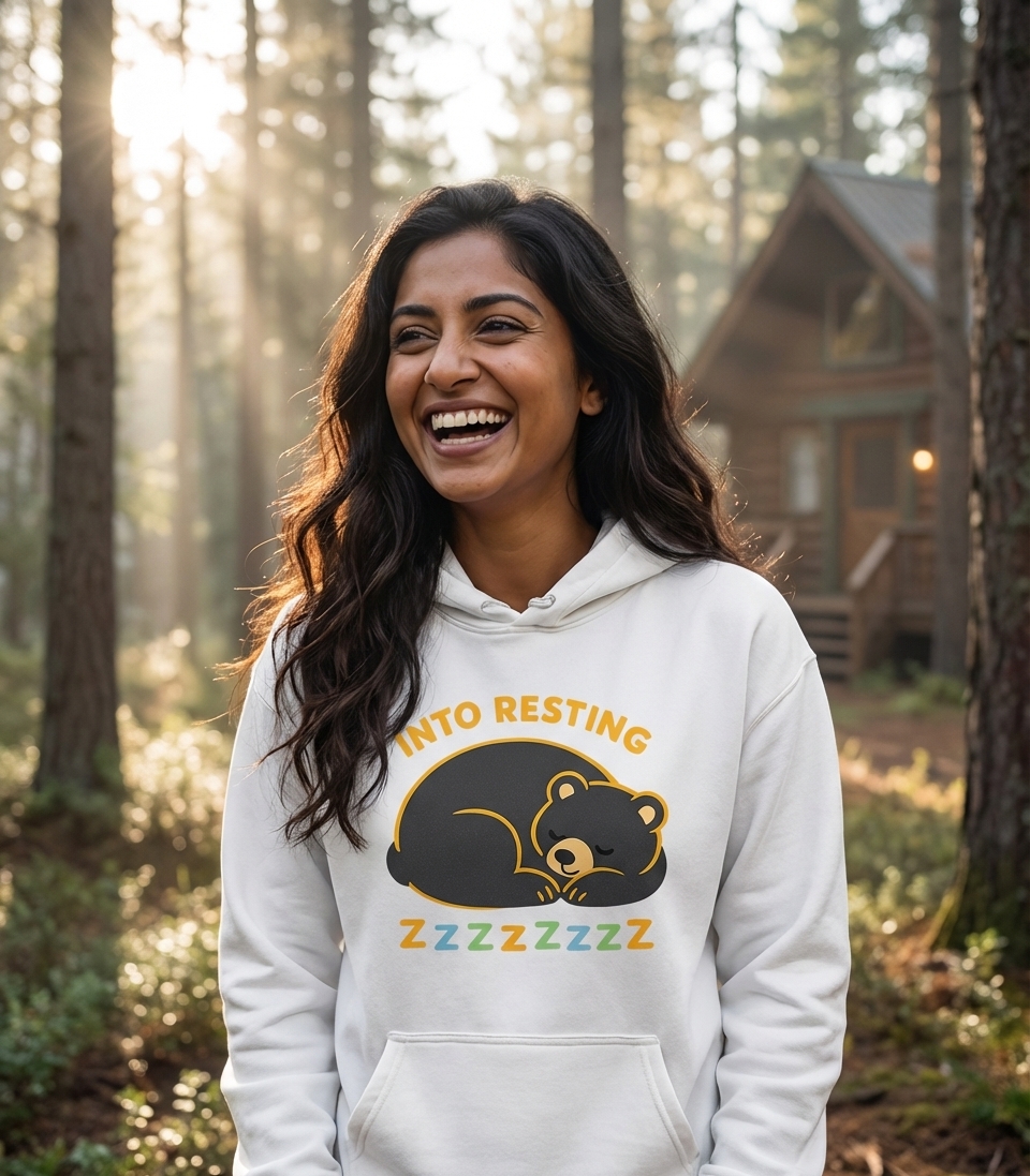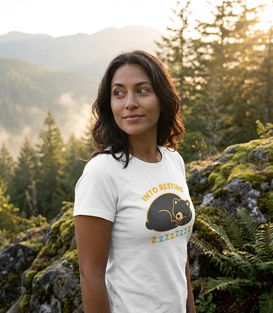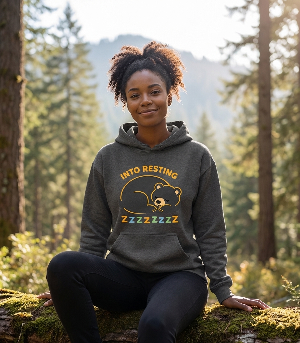 This charming design features a cute cartoon bear curled up in a deep slumber, with 'Zzzzzzz' floating beneath it, symbolizing peaceful rest. The phrase 'Into Resting' arches above, setting a perfectly relaxed tone. It's a sweet and simple graphic for anyone who cherishes downtime.