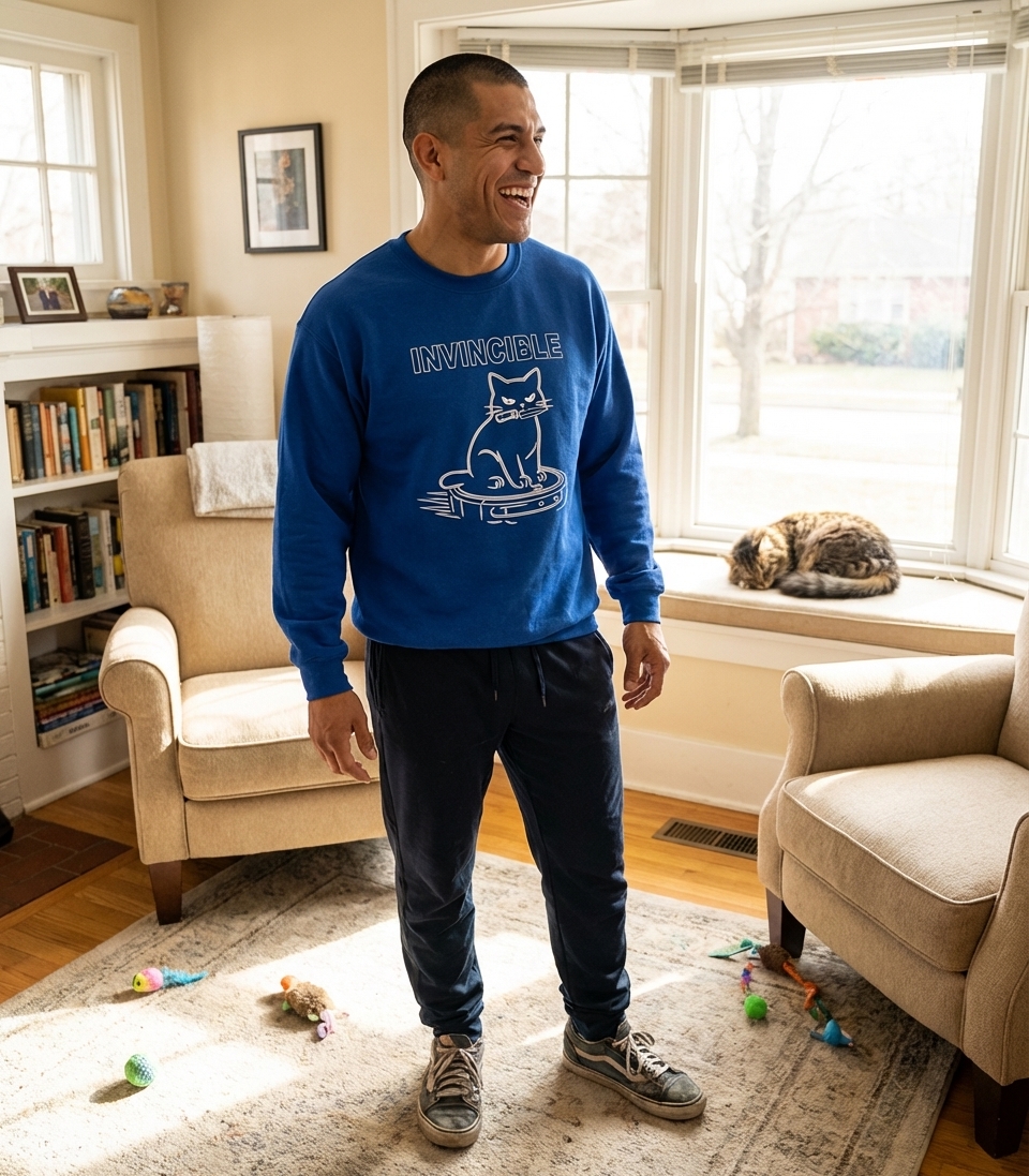 This "Invincible Cat Robot Vacuum" design celebrates the playful dominance of felines who rule their homes, ride their tech, and always come out on top.