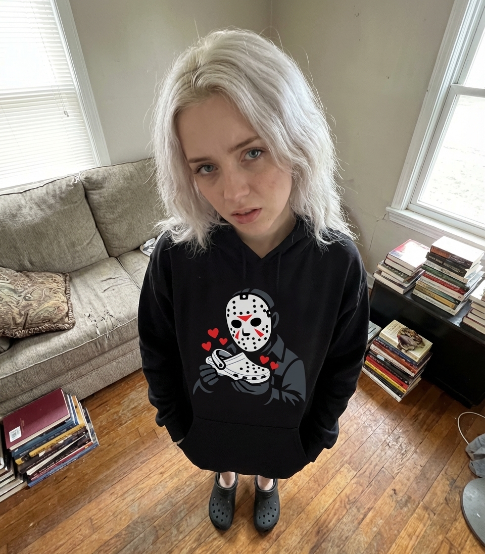 This unique graphic features the classic horror character, Jason Voorhees, holding a Croc shoe with hearts floating around him. It’s a humorous and unexpected take on a beloved slasher icon, blending fear with a surprising sense of affection. The artwork plays on the irony of a terrifying figure finding comfort in casual footwear.