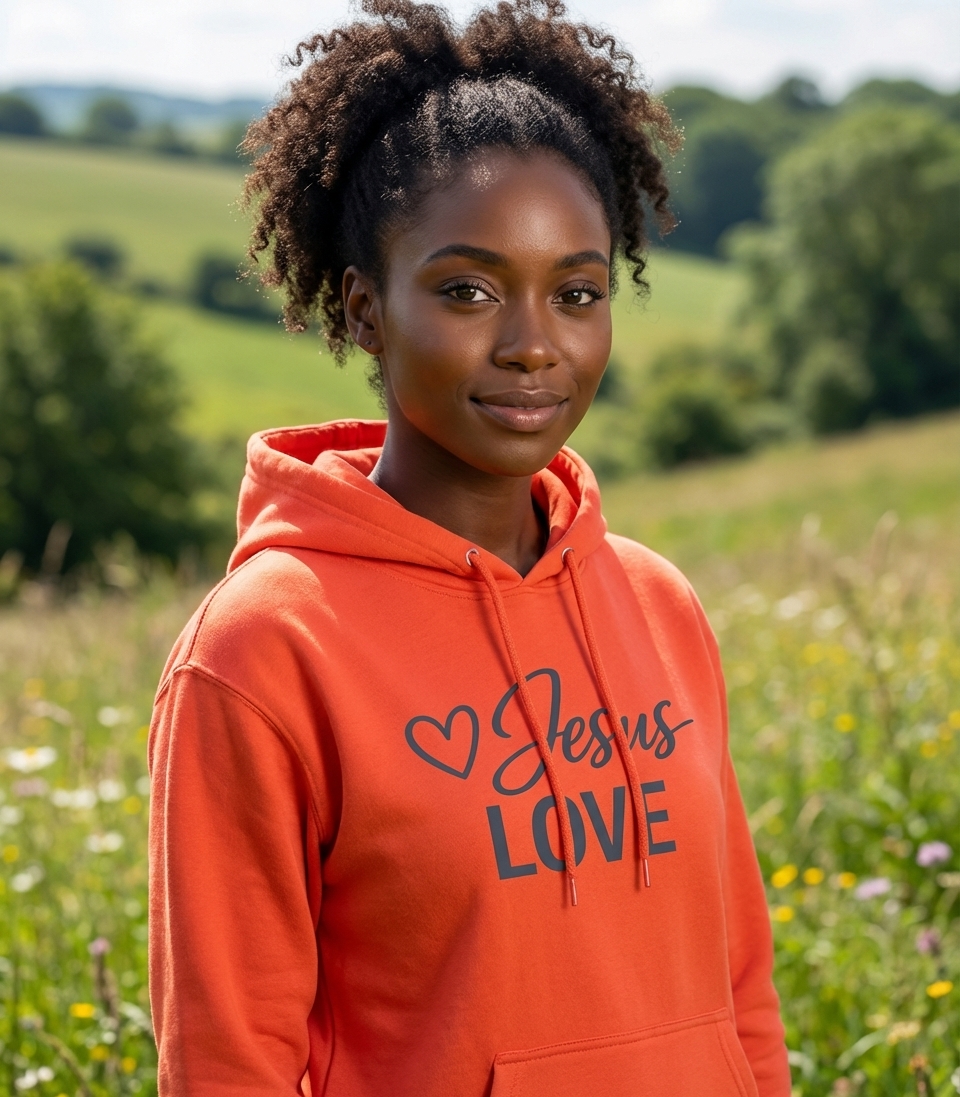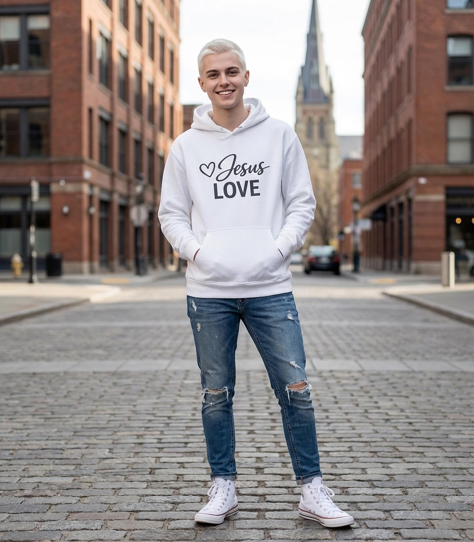 The 'Jesus Love' phrase captures the lifestyle of faithful believers who share their devotion, live by compassion, and embrace divine guidance.