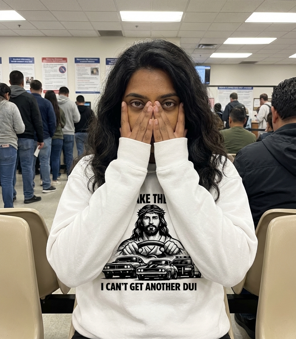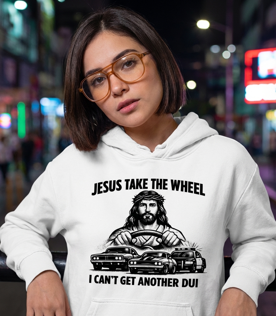 The core phrase "Jesus Take The Wheel" is a popular expression asking for divine intervention and guidance in difficult or overwhelming situations. In this humorous rendition, the added line "I Can't Get Another DUI" recontextualizes the spiritual plea into a relatable, albeit edgy, acknowledgment of past mistakes and a desperate need for a higher power to make better choices on the road.