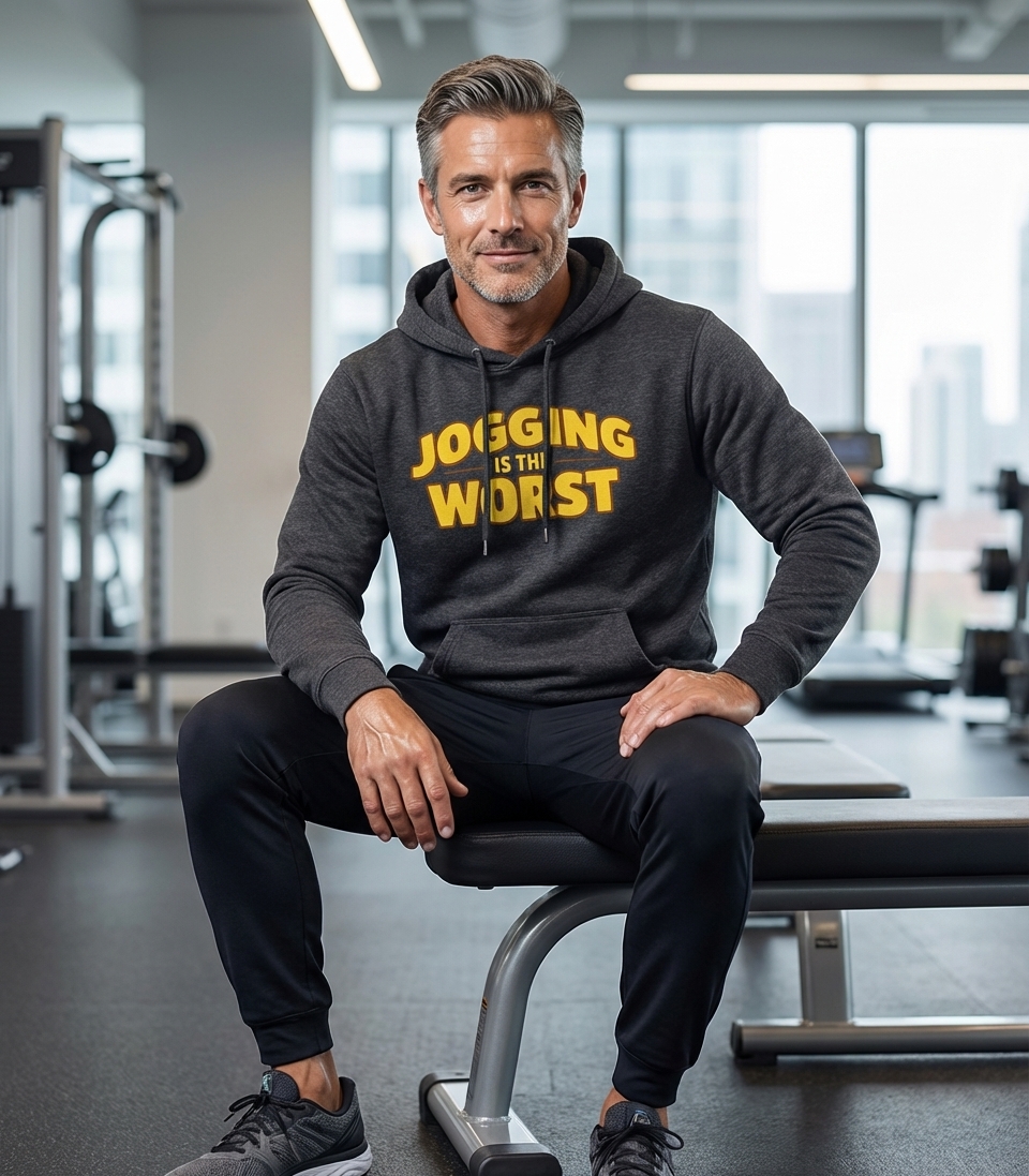 The "Jogging Is The Worst" phrase captures the lifestyle of passionate anti-runners who prefer comfort, relaxation, and a good laugh over strenuous cardio.